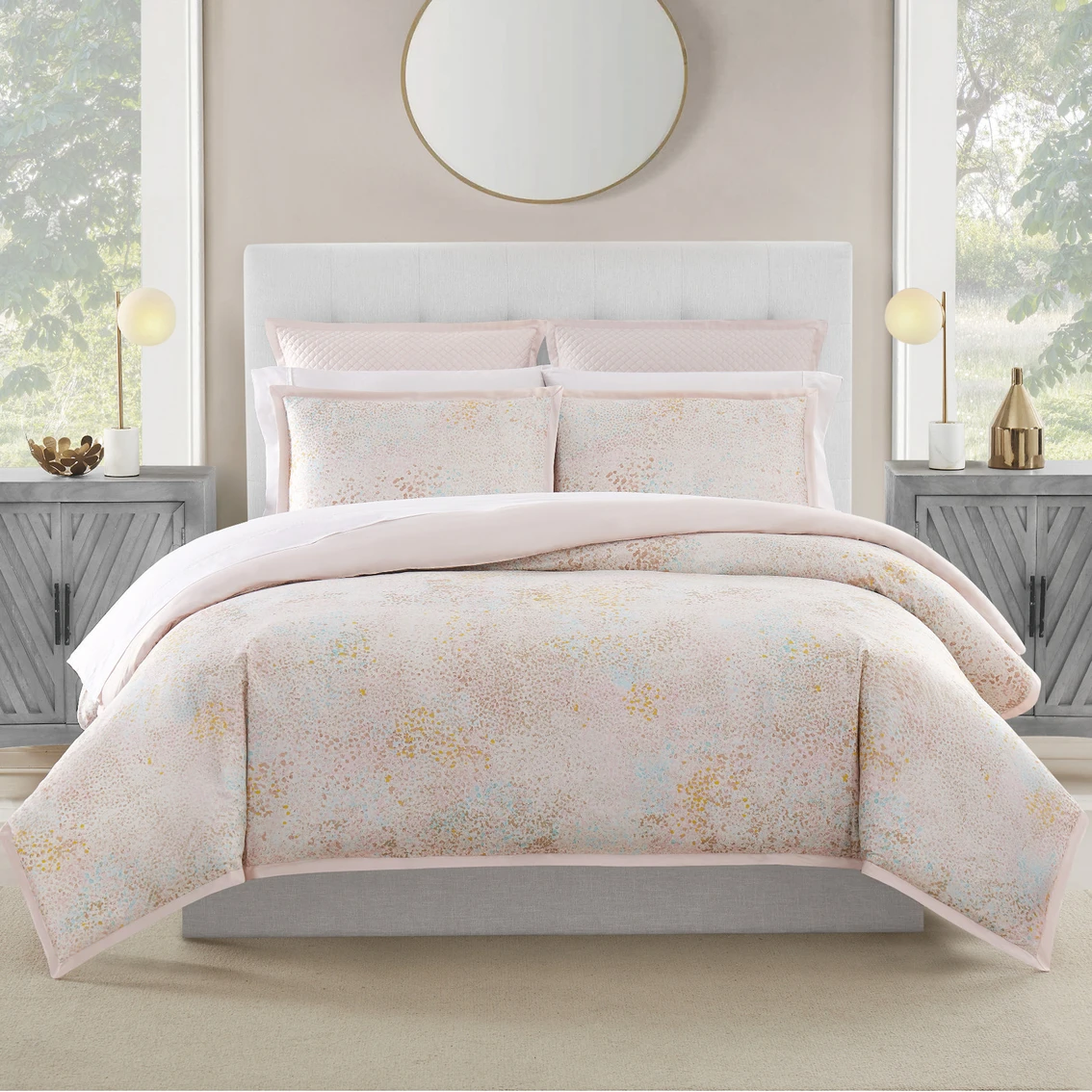 This beautiful soft watercolor confetti print by Charisma has pearlescent accents, which adds a touch of elegance to any bedroom. The comforter is digitally printed 100% cotton, 300 thread count sateen fabric with accents on the face. Style: CS4168QN-1500.