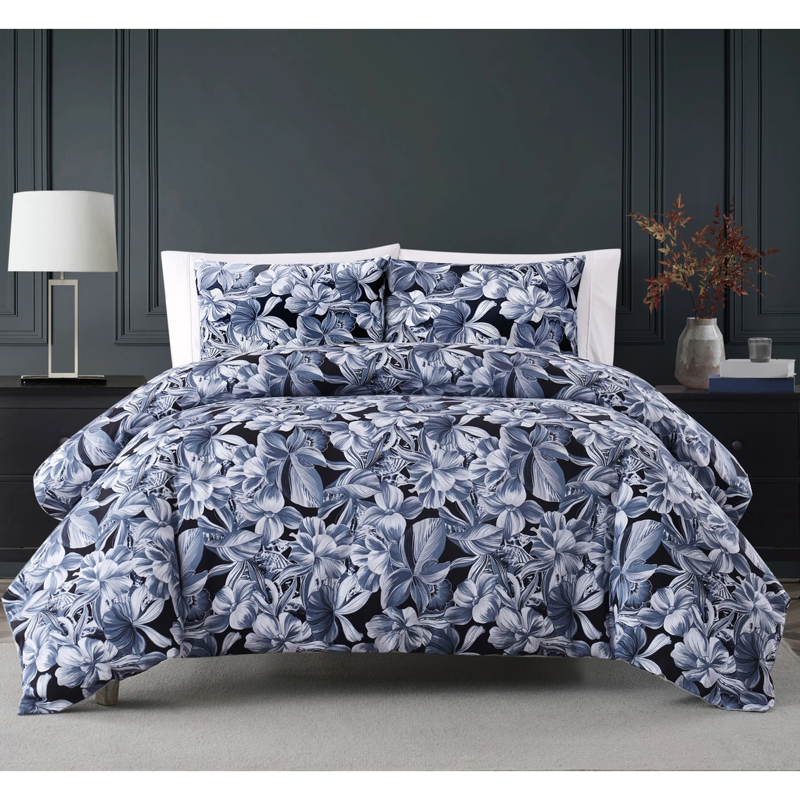 Beautifully drawn florals in tones of gray and smokey blue stand out against the black background on this print by Christian Siriano which is digitally printed on 100% cotton sateen woven fabric. The Christian Siriano Talia 3 pc. Duvet Cover Set includes coordinating shams in the same color and fabric as the quilt. Model: DCS4137FQ-1800.