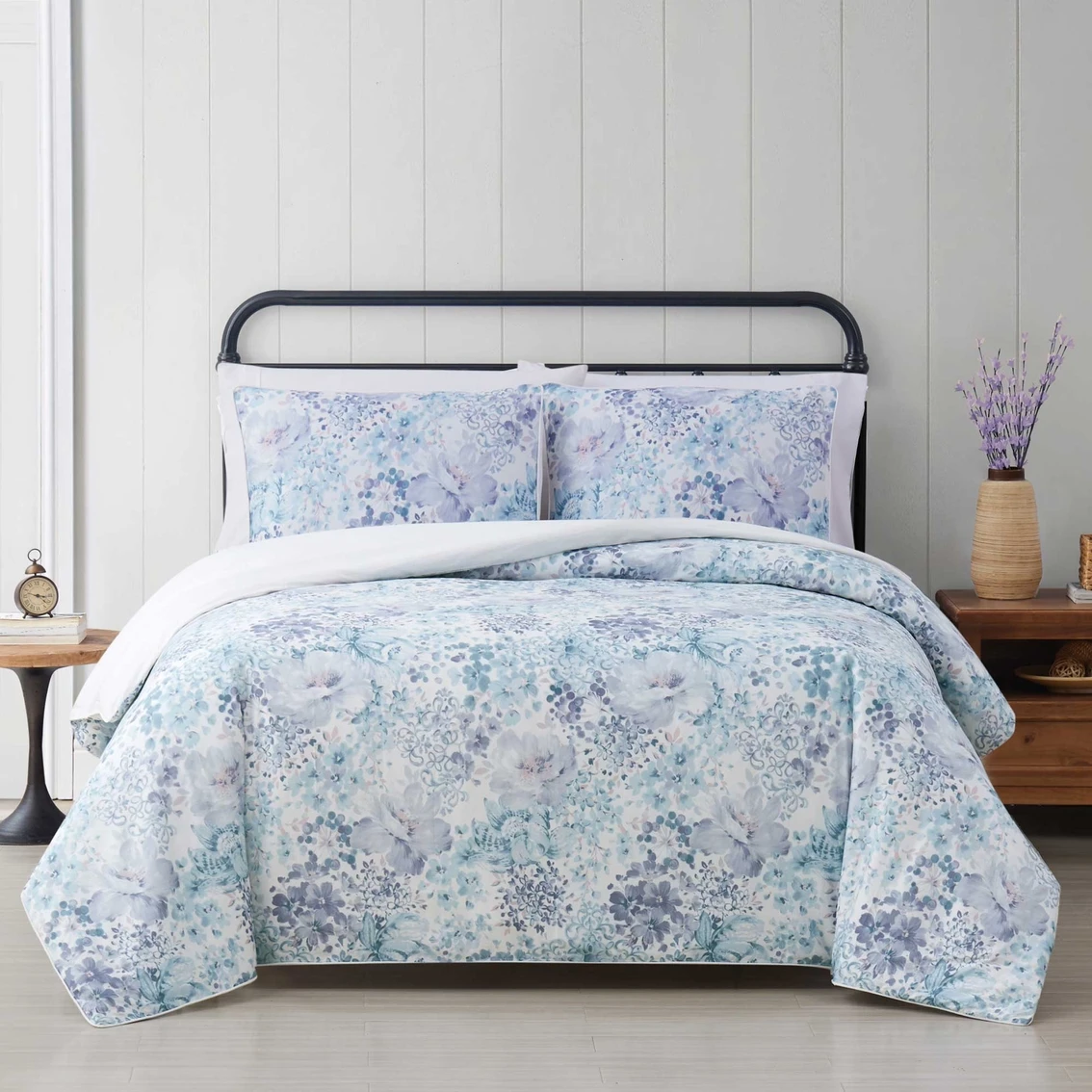 The Cottage Classics Charlotte Floral Comforter Set features a medium scale floral print that uses soft blue and lavender colors on a white background to bring a calming feel into your bedroom. The 100% cotton, 200 thread count sateen face is smooth to the touch and the back is a solid white 144 thread count, 100% cotton fabric. The item includes pillow shams with the same print from the face of the bed and uses the white reverse cloth. All items are machine washable. Model: CS4011FQ-1500.