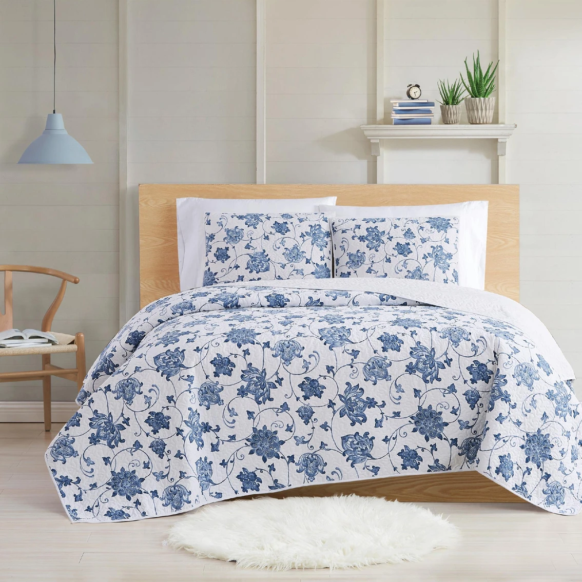 This classic toile pattern is a great addition to a traditional bedroom in 100% cotton face fabric. The Cottage Classics Estate Bloom 3-piece quilt set includes one quilt and two standard shams (one sham for twin). Face fabric is printed 100% cotton woven cloth. The reverse is 100% brushed microfiber in a solid white color. Quilts are filled with 50% cotton and 50% polyester filling. This item is machine washable, but care should be taken to wash in appropriate size equipment to avoid damage.
