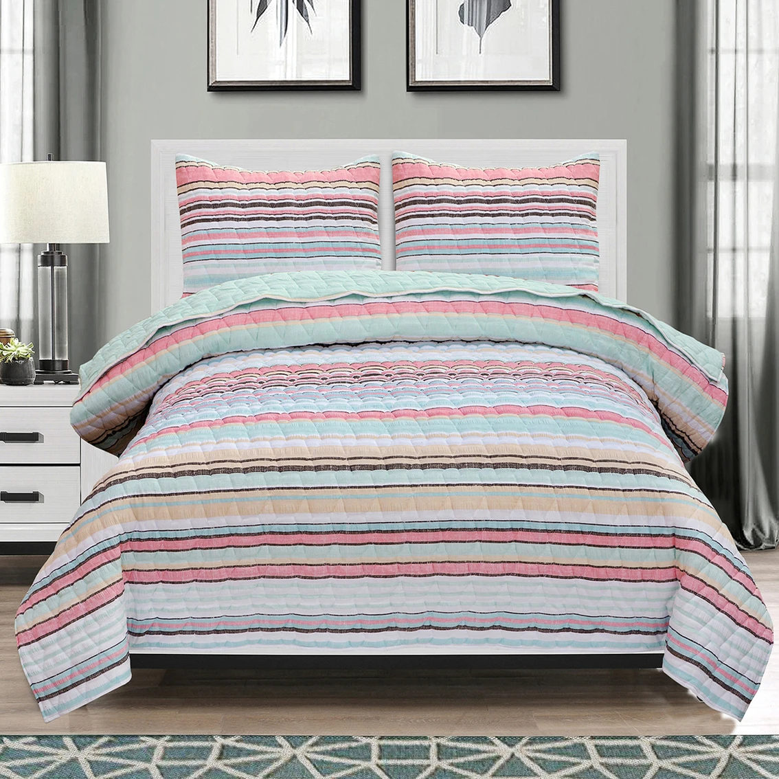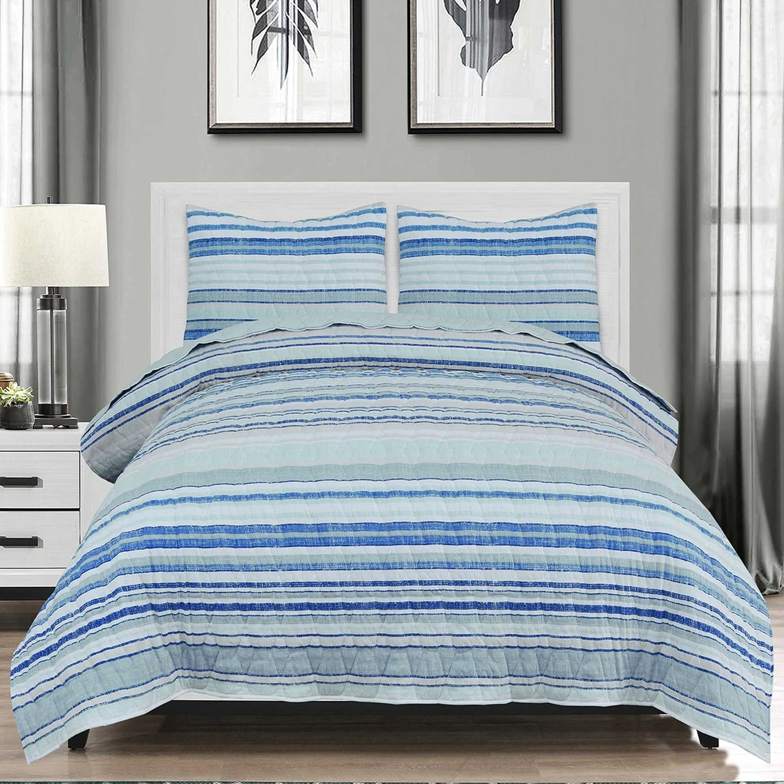 This EnvioHome Cotton Blend Reversible Seersucker Striped Quilt Set features a reversible quilt that’s perfect for warm weather. Made with a high quality, soft cotton rich blended fabric perfect for all year-round use. Fabric maintains brightness and shape to ensure a finished look for your bedroom. The quilt becomes a great accent and looks ideal in any bedroom with its eye-catching design and decorator friendly colors. Full/Queen and King quilt set includes quilt and two shams, Twin comes with quilt and one sham. Style: SS87829-US-M.