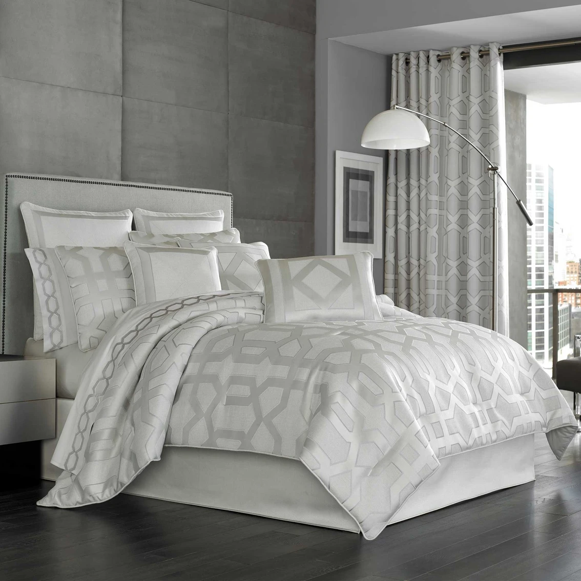 The Five Queens Court Kennedy Sterling 4 pc. Comforter Set is a modern geometric design containing rich shades of silver. The geometric pattern combines with a simple elegance to create this chic ensemble. The oversized comforter is embellished with a solid satin piping. This set includes one beautifully designed comforter, two perfectly matched padded pillow shams with a hidden zipper. Pillow shams are engineered to offer a one of a kind decorator look, centering the geometric design with satin piping. The bedskirt is solid satin, containing split corners and a 15 in. drop. Style: 2048148QCS.