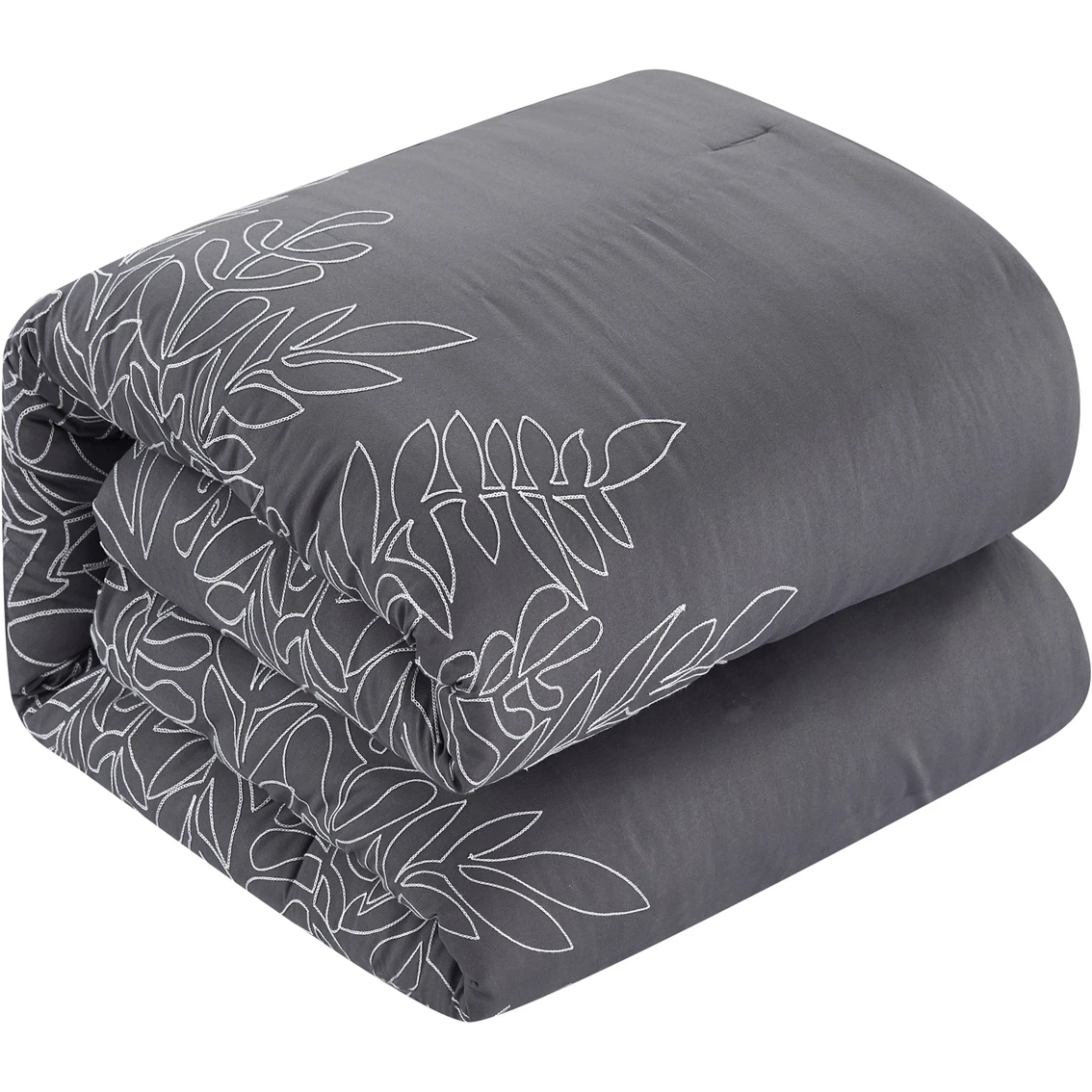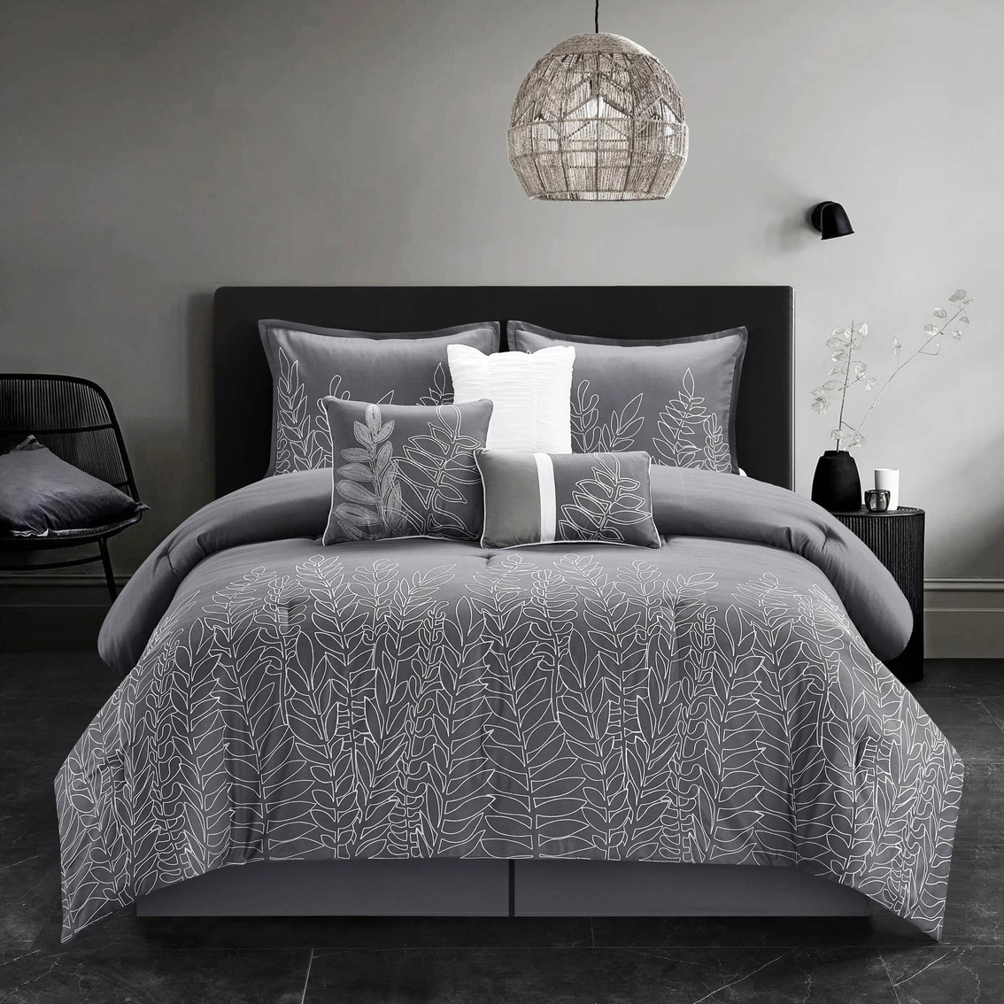 Redefine your master suite and revel in deep slumber by adding this Grand Avenue Alicia Comforter 7 pc. Set to your bedroom. Brimming with minimalist elegance, this comforter set is embellished with a stylish fern pattern set against a monochromatic grey background that complements any modern interior and furniture in the bedroom. Constructed of 100% polyester fabric and filling, this bed set comes with one (1) fluffy comforter, two (2) shams, one (1) solid bed skirt and three (3) opulent pillows that flaunt excellent workmanship and quality. This beautiful comforter is easy to clean and stands up well to machine washing and drying. Model: Alicia7.
