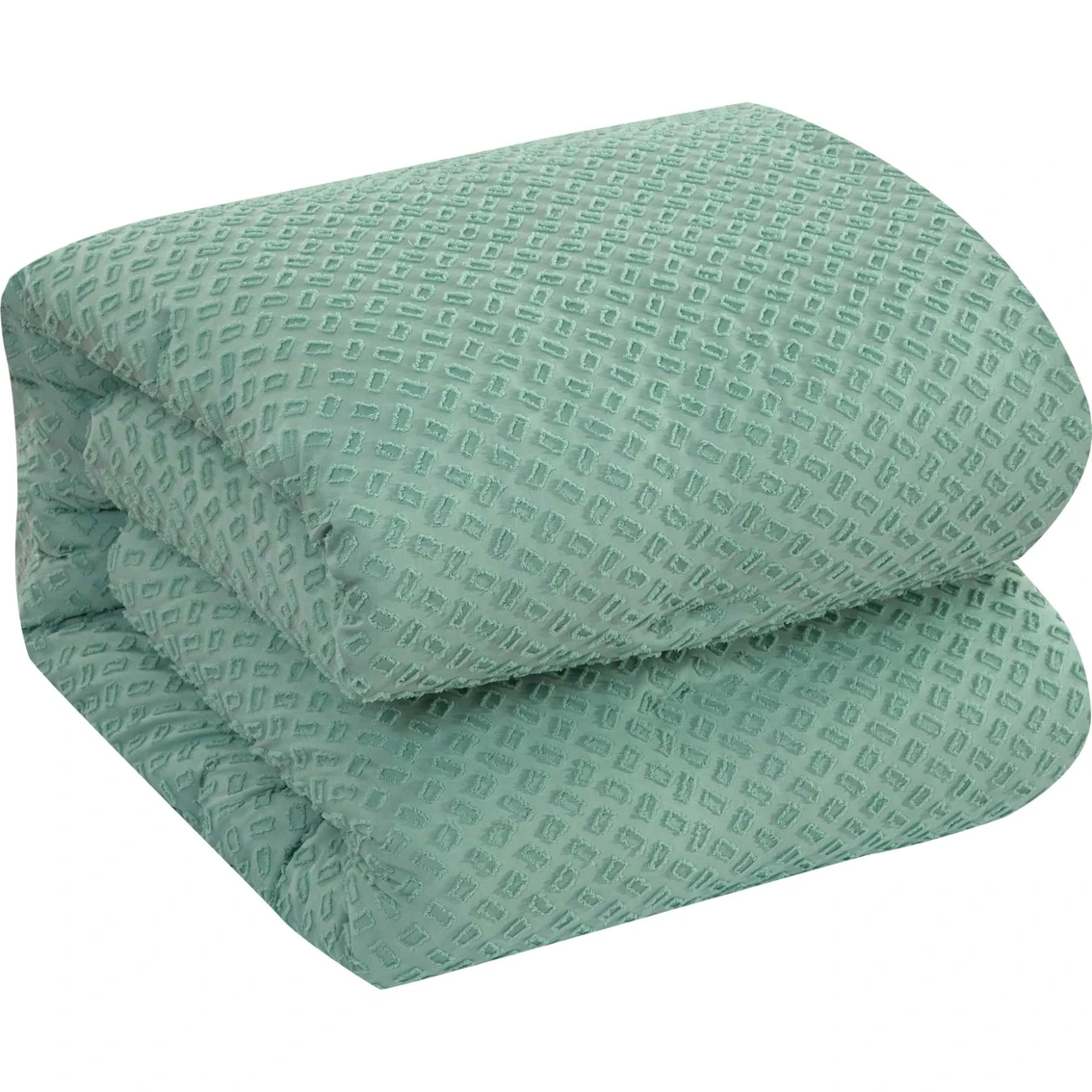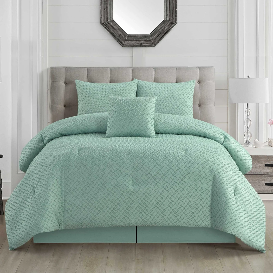 Turn your bedroom into a slumber retreat with this beautiful and elegant comforter 5-pc. set from Grand Avenue featuring an eyelash 3D clip jacquard technique in a small scale pattern for an overall cozy surface. This minty sage color adds pop to your bedroom decor for that perfect touch for boho, back-to-school, and casual lifestyle trends. Constructed of 100% polyester fabric and filling, this bed set comes with 1 comforter, 1 bedskirt, 2 shams and 1 decorative pillow that flaunt excellent workmanship and quality. The complete bed set built to last, this bedding set is made with strict quality control standards and comes with everything you need for a complete bedroom makeover. Made with high strength polyester, this beautiful bedding set can be machine washed and dried on a low tumble setting for easy care. Model: Antonio5-Q-MNT.