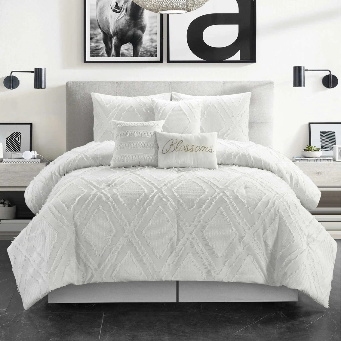 Spruce up your master suite with the enchanting appeal of this 7-pc. comforter set from Grand Avenue. The comfy comforter and shams flaunt exquisite embroidery in white velvety fabric for a simple yet elegant look. With a polyester microfiber design, this comforter set includes one (1) comforter, two (2) shams, one (1) bed skirt and three (3) decorative pillows. One of the pillows features metallic typography that adds to the alluring charm of the set. Soft to the touch and long-lasting, this bed set can be machine washed for a better snuggle. Model: Cearo7-Q-WHT.