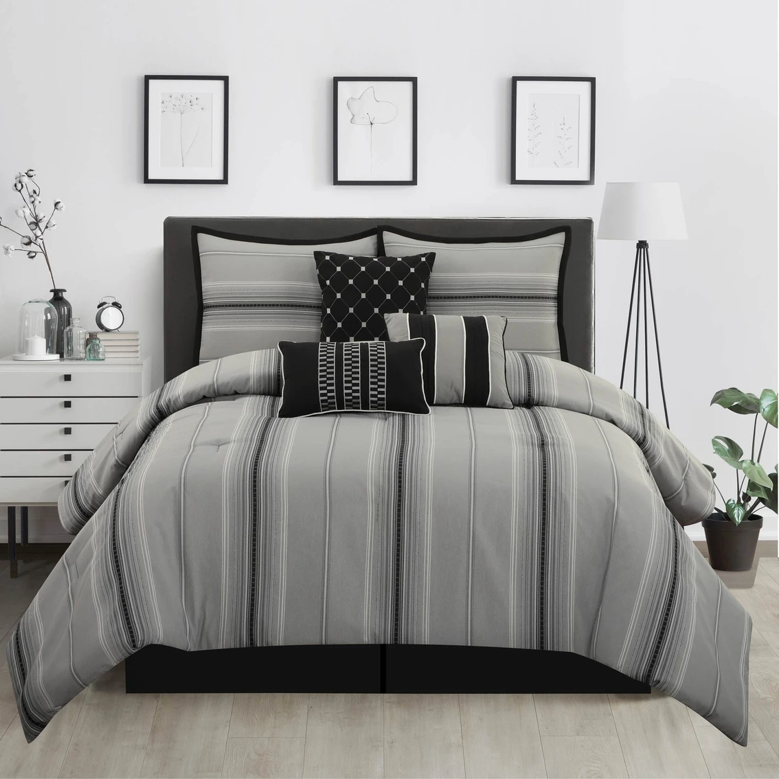 Give your bedroom a cozy and elegant ambiance with this beautiful 7-piece comforter set from Grand Avenue. It features a classic light gray, black and off-white striped design for the perfect mix of traditional style with a modern flair. Built to last, this bedding set is made with strict quality control standards and comes with everything you need for a complete bedroom makeover. Made with high strength polyester, this beautiful bedding set can be machine washed and dried on a low tumble setting for easy care. Model: Eli7-GRY.