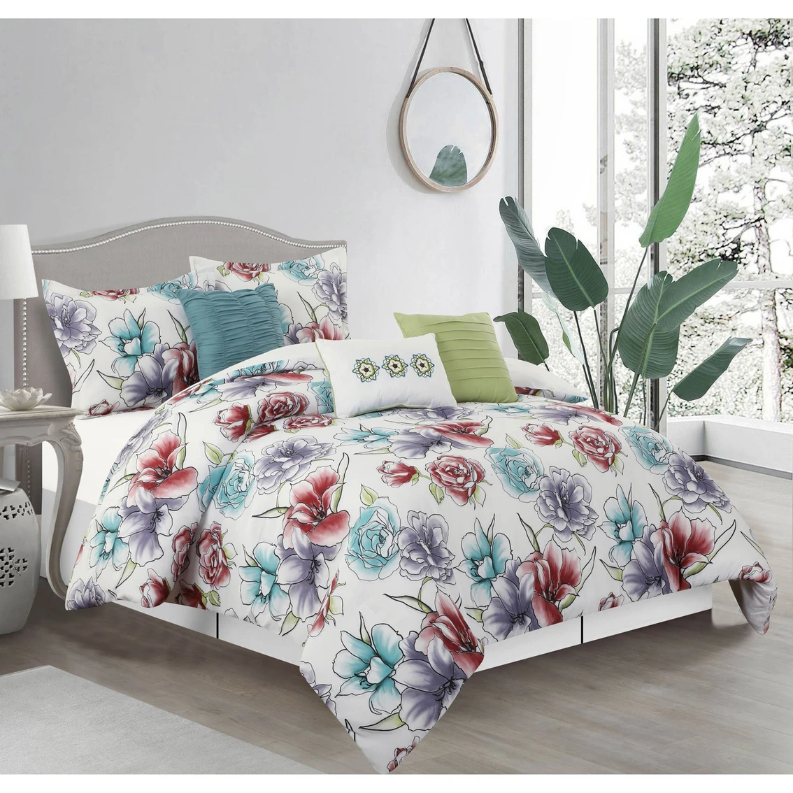 Elevate your room’s aesthetic and cozy up with this beautiful comforter set from Grand Avenue. Featuring colorful watercolor flowers in blue, green, purple and red on white, the floral patterns add an elegant and luxurious atmosphere to your bedroom. Constructed of 100% polyester fabric and filling, this bedding set is built to last and made with strict quality control standards and comes with everything you need for a complete bedroom makeover. Made with high strength polyester, this beautiful bedding set can be machine washed and dried on a low tumble setting for easy care. Model: Floranda7-MLTI.