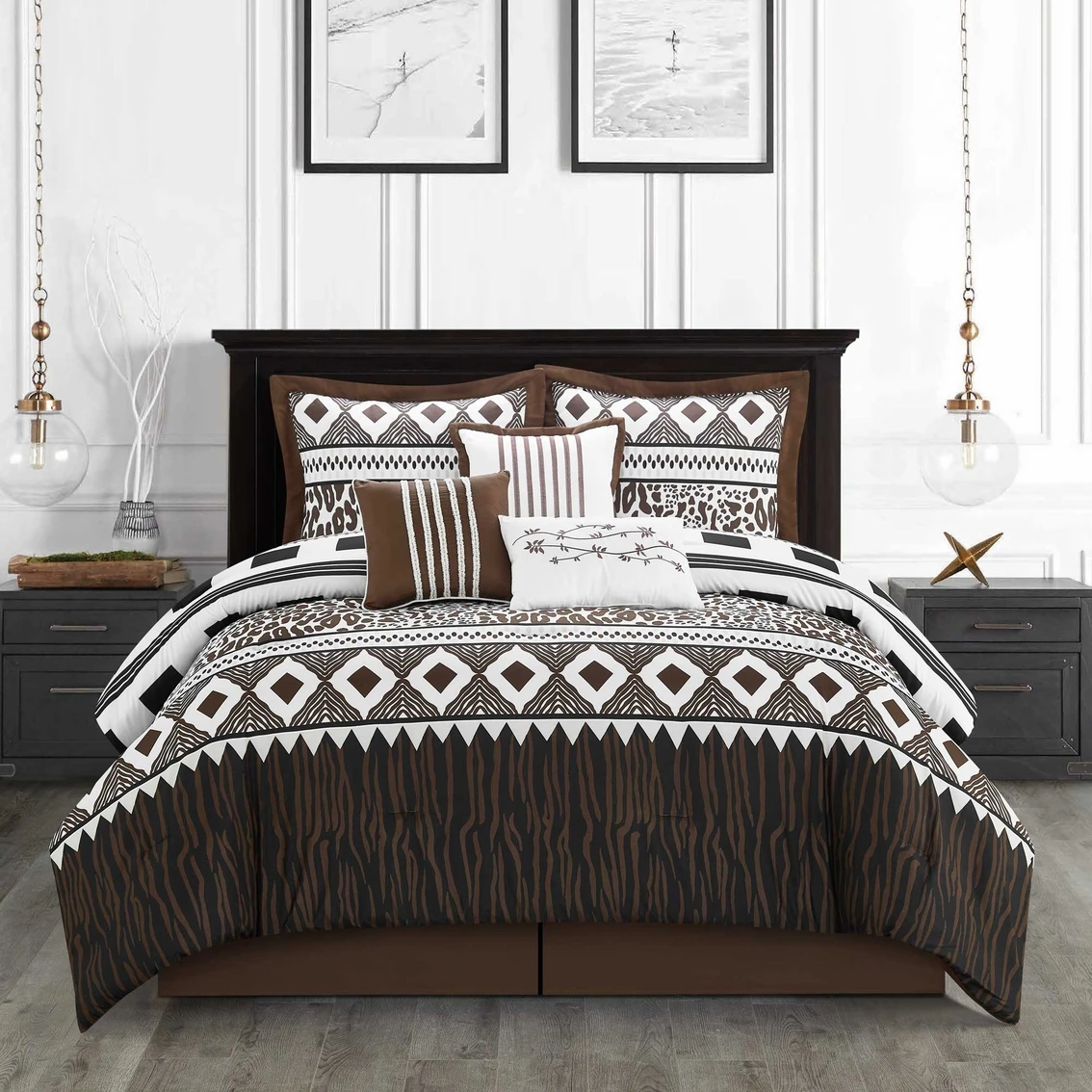 Dark bohemian design. The Grand Avenue Kiara 7 pc. Comforter Set features bohemian ethnic styling with retro striped pattern design. The unique tribal comforter set with dark colors is charming and luxurious. If normal geometric styles and designs are getting old, this Grand Avenue bedding set offers a fun, bold yet comfortable alternative. Set Includes comforter, two pillow shams, bedskirt and three decorative pillows. Style: Kiara7-Q-COFF.