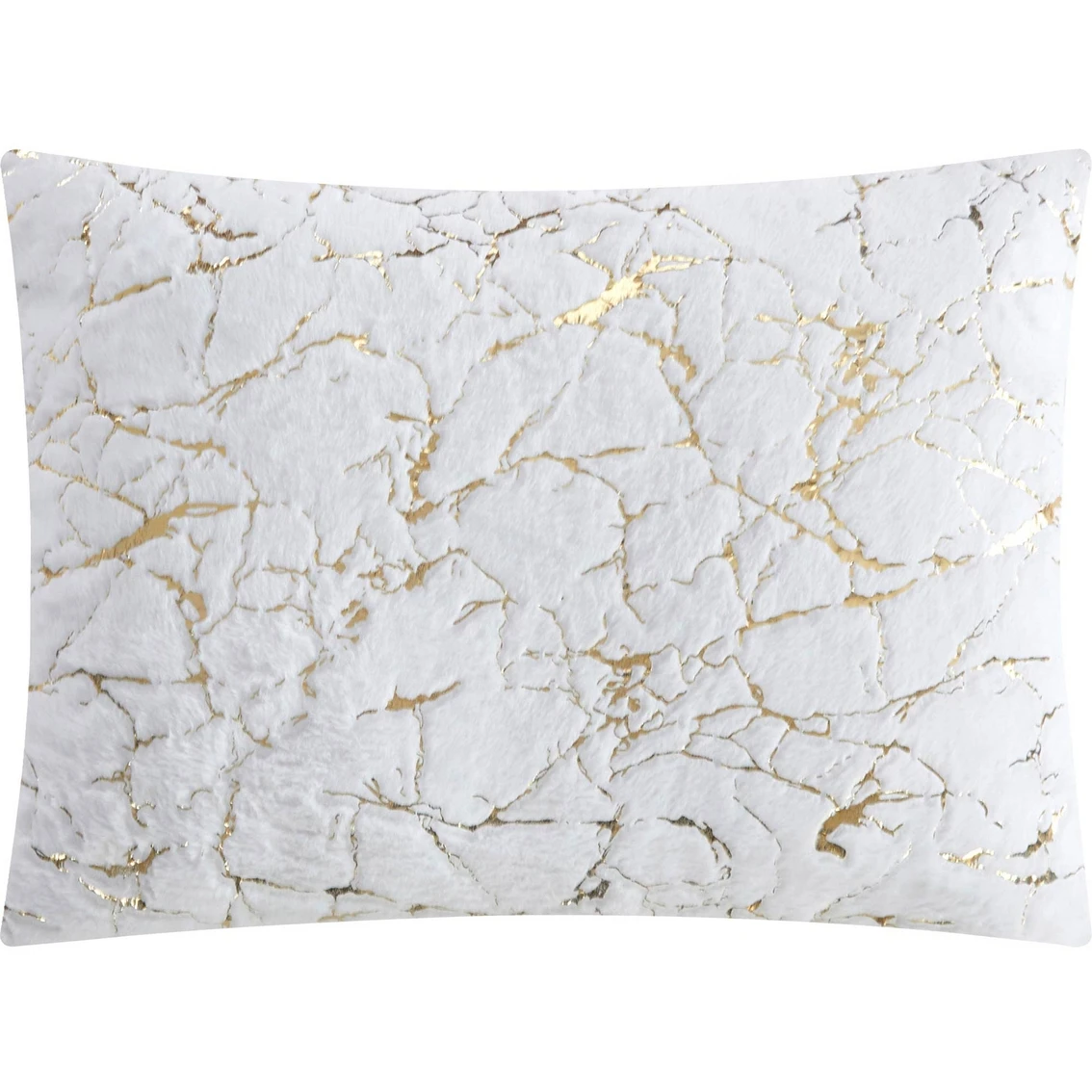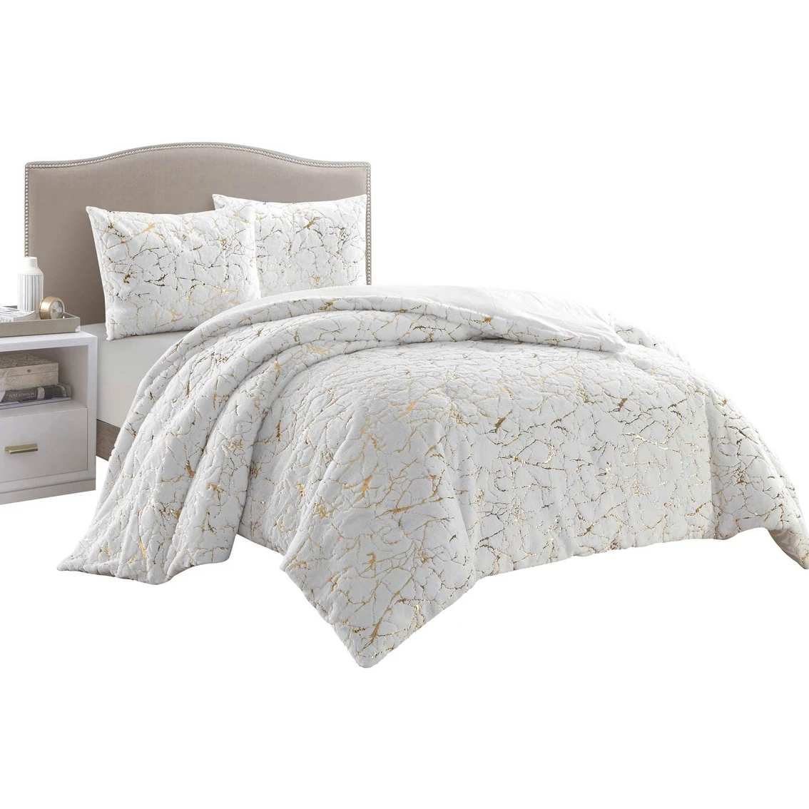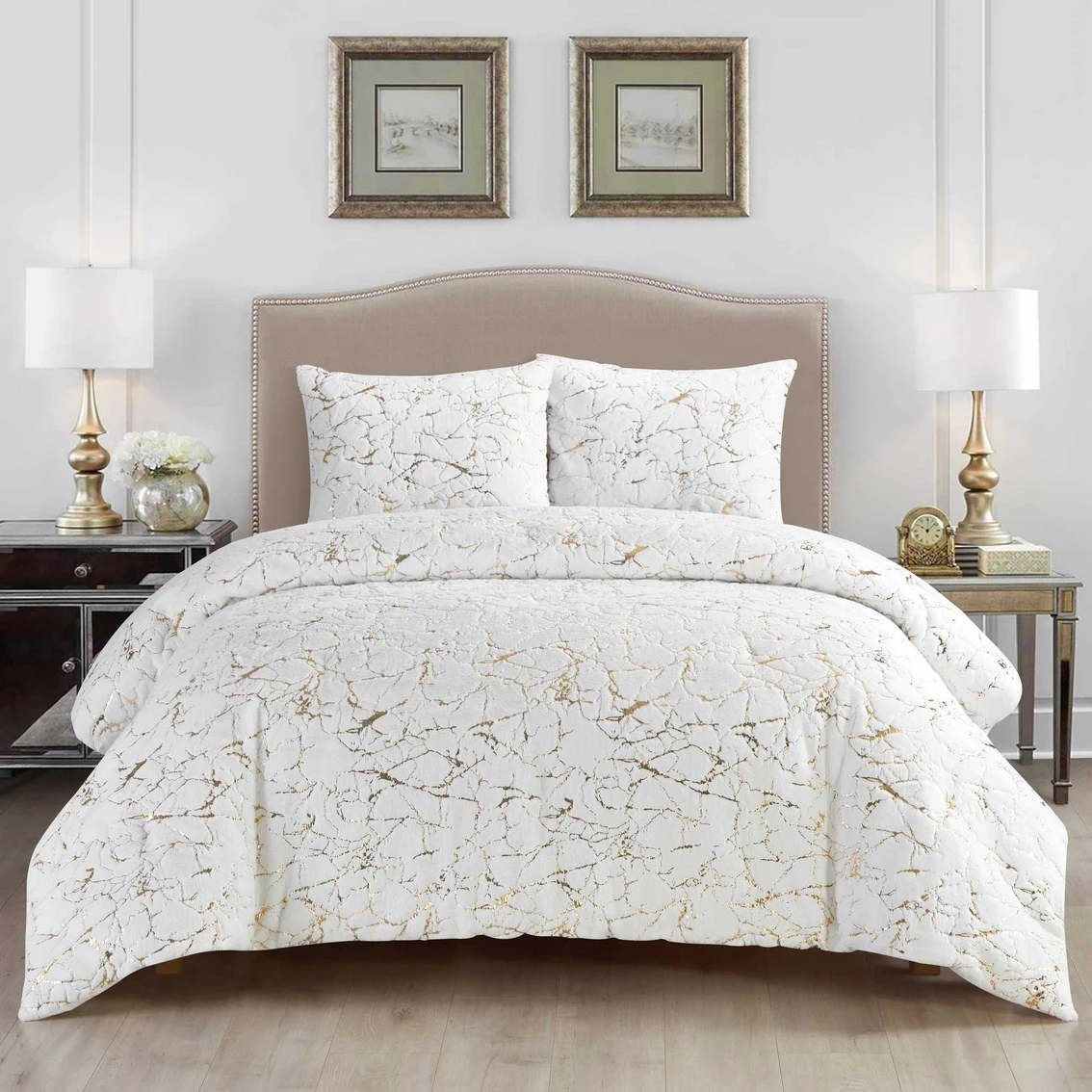 The Mansfield 3 pc. Comforter Set from Grand Avenue features winter white plush accented with gold foil marble-like texture that blends softly and cozily with a bit of glam. The three-piece set includes one comforter and two pillow shams. Model: Mansfield3-WHT.