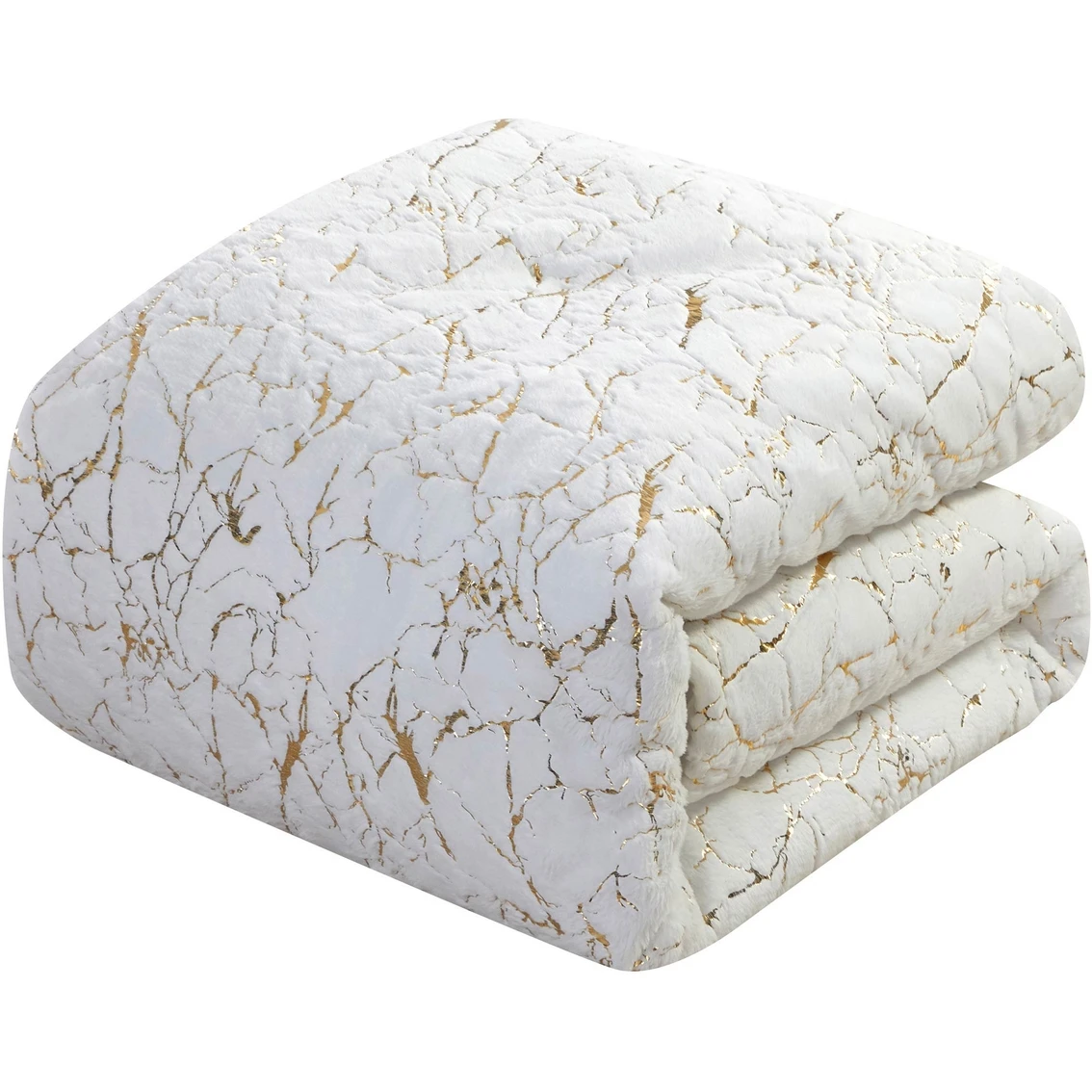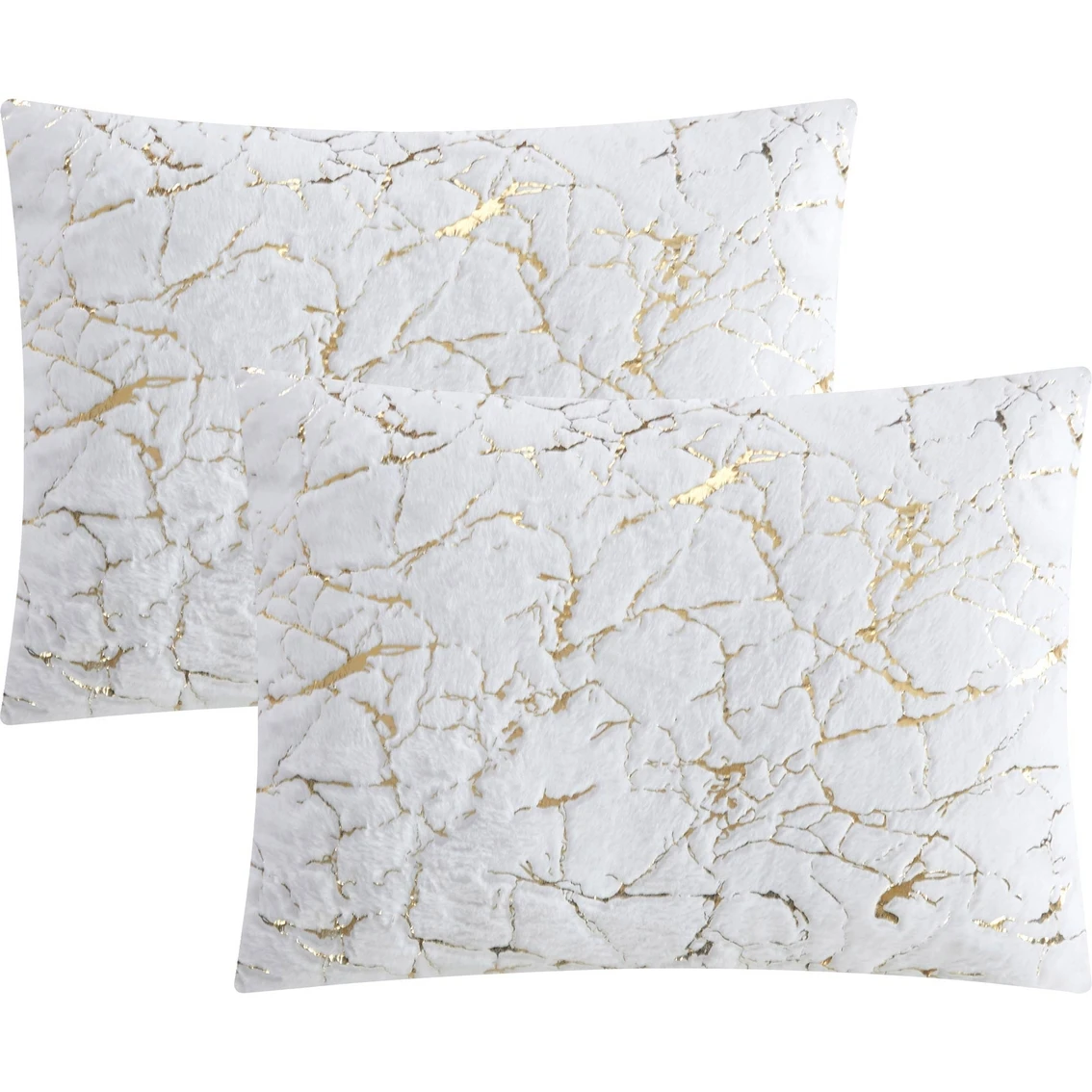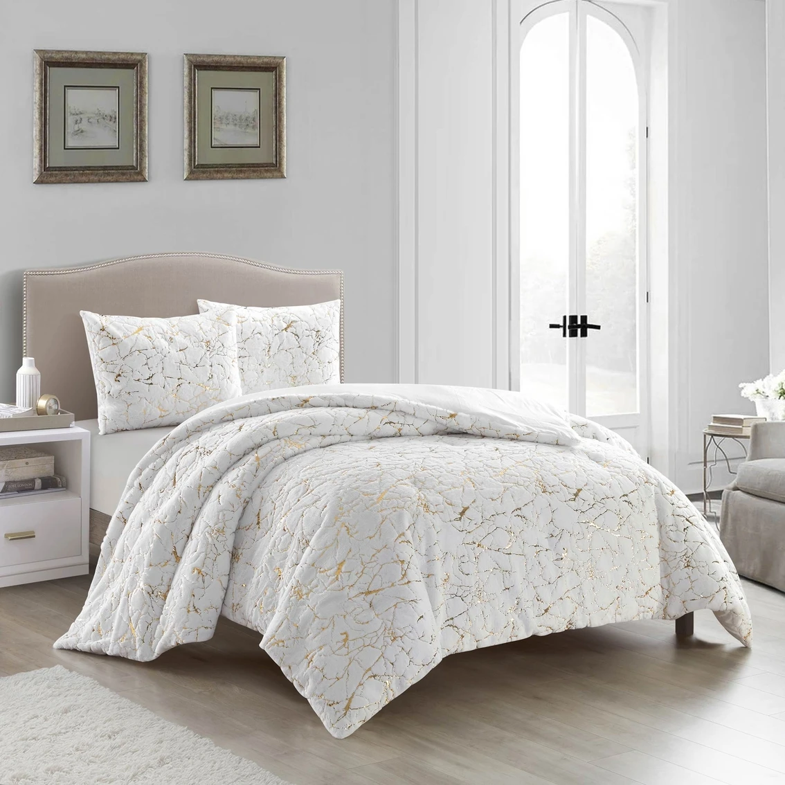 The Mansfield 3 pc. Comforter Set from Grand Avenue features winter white plush accented with gold foil marble-like texture that blends softly and cozily with a bit of glam. The three-piece set includes one comforter and two pillow shams. Model: Mansfield3-WHT.