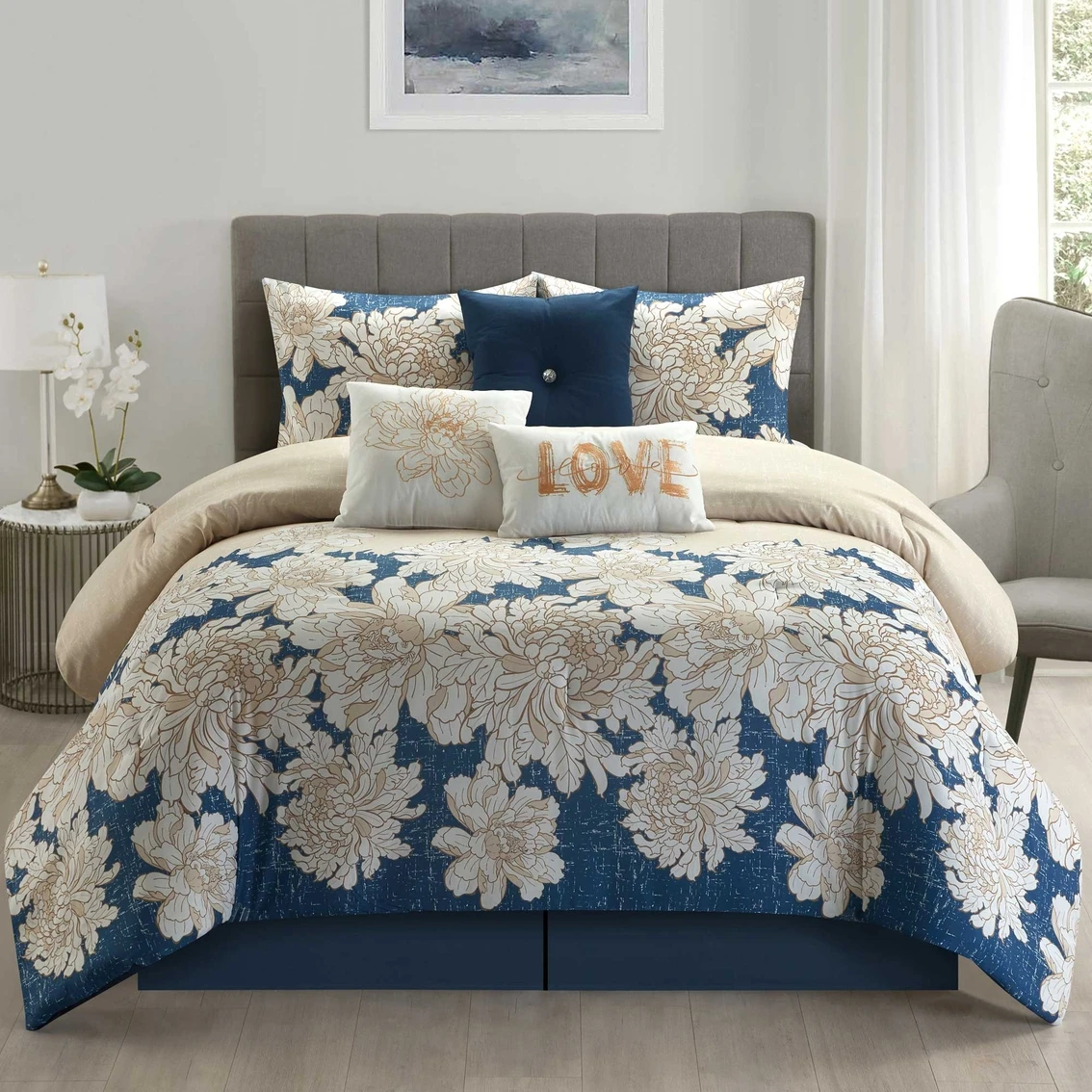 Turn your bedroom into a slumber retreat with this beautiful and elegant comforter set from Grand Avenue, featuring a grand chrysanthemum floral print flanked between blue and tan. Constructed of 100% polyester fabric and filling, this bed set comes with 1 comforter, 2 shams, 1 bed skirt and 3 decorative pillows that flaunt excellent workmanship and quality. The complete bed set built to last, this bedding set is made with strict quality control standards and comes with everything you need for a complete bedroom makeover. Made with high strength polyester, this beautiful bedding set can be machine washed and dried on a low tumble setting for easy care. Model: Wealthy7.