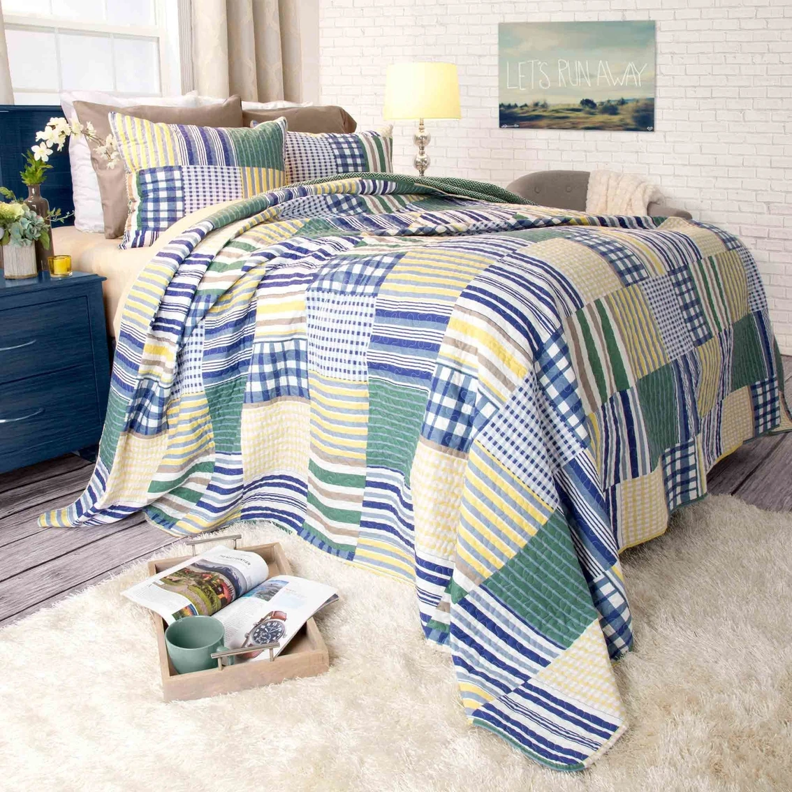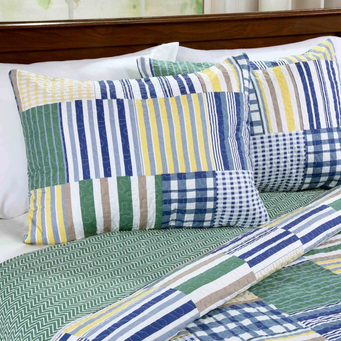 Add flare to any bedroom with the bold patterns and bright colors of the Lynsey Quilt Set by Lavish Home. The soft microfiber quilt features classic stripes and trendy plaid in blues, greens and yellow, creating a relaxing mood. Sets include sham(s) in the same bold print. Twin set includes quilt and one standard sham; Full/Queen set includes quilt and two standard shams; King set includes quilt and two king size shams.