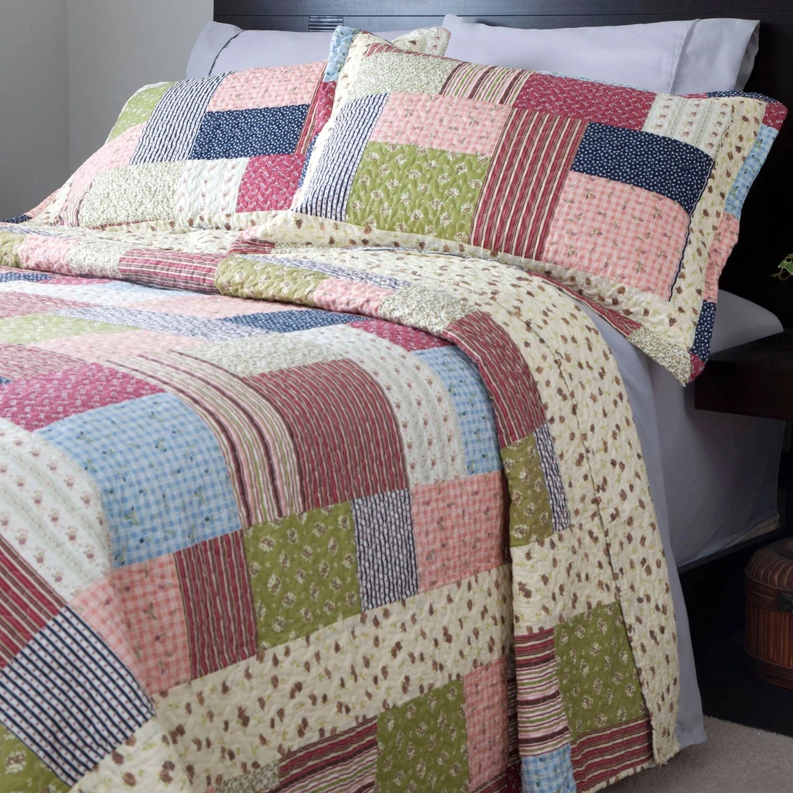 Add charm to your bedroom with this quilt set. The pattern is printed in soft and bright colors to compliment any decor. Shams included for extra value and complete the look. This quilt set features a soft polyester quilt with a cotton-and-poly blend fill. Style: 66-10003.