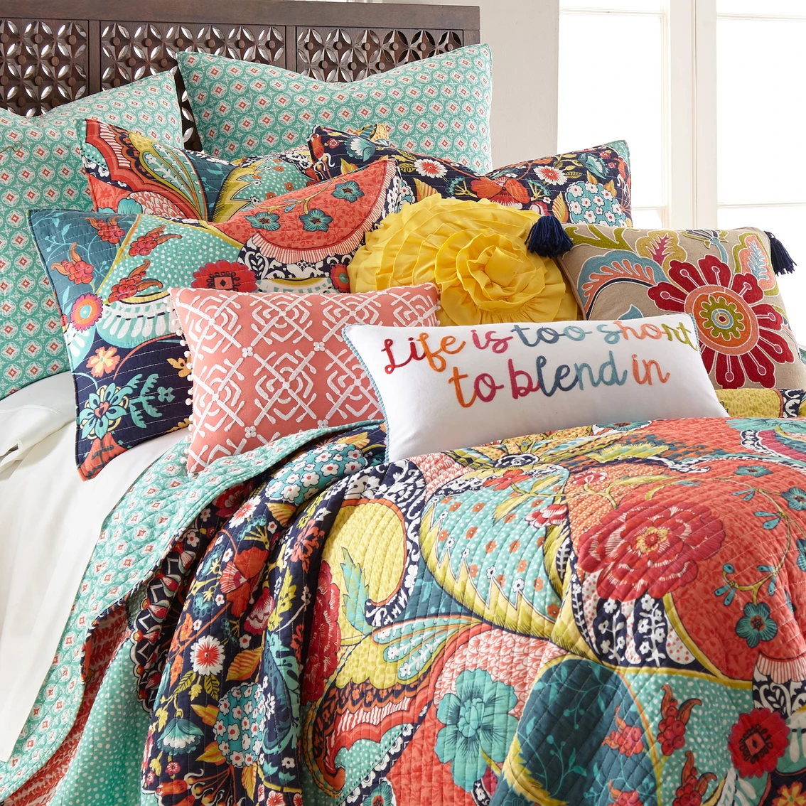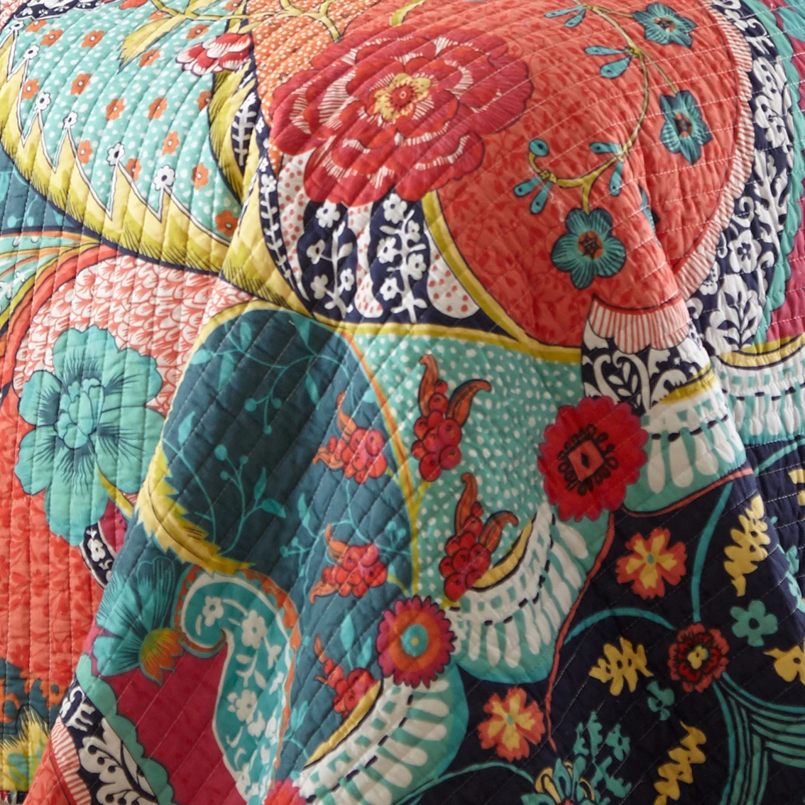One of Levtex Home’s most popular quilt sets, Jules is inspired by classic art piece with a teal, blue, pink, orange design and a charming reverse pattern of teal architectural tile icons. A bound border provides contrast and texture to complete the look. Made from 100% cotton that will never ever feel heavy, stiff or uncomfortable, the Jules quilt and pillow sham set has an ultra soft feel that you’ll simply love. The quilt is very generously sized to give your bedroom a feeling of comfort and luxury. Used by itself as a layering piece or as a bedspread, this bedding set is extremely versatile. Model: L11480.