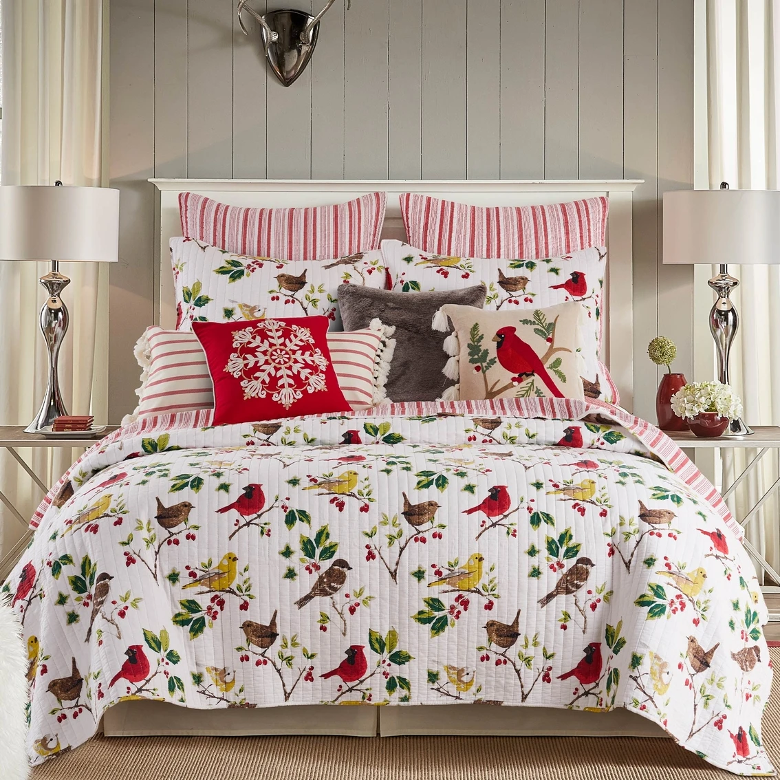 The Joy Birds Reversible Queen Quilt by Thatch Home for Levtex Home is inspired by watercolor etchings of birds. Offered in red, green, citron, taupe and brown, this design will immediately transform your bedroom. This reversible quilt features birds perched on sprigs of holly in cotton on the front, reversing to a red and white stripe in microfiber on the back. The Queen Quilt (88x92in.) is filled with a cotton rich filler and is machine washable. Enjoy this for years to come!