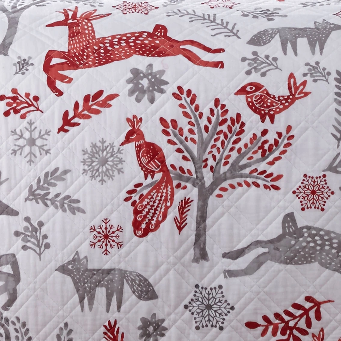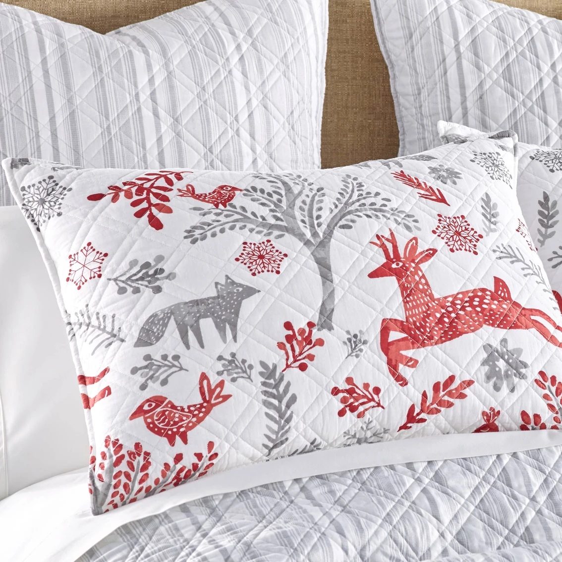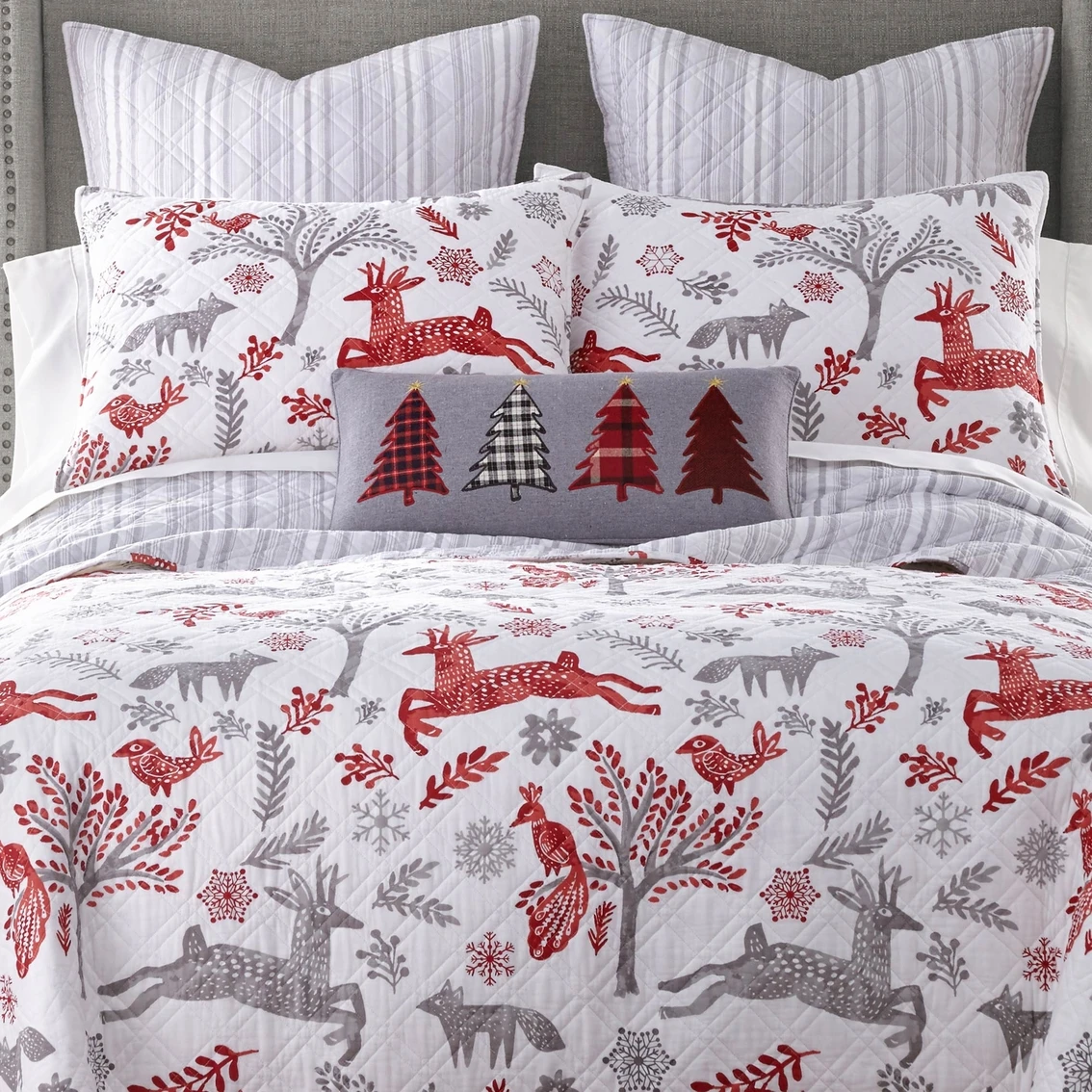 Levtex Home’s Winterland Reversible Quilt Set brings warmth and festive style into your bedroom. This beautiful quilt set features an reindeer, snowflake and tree design in grey and red hues, and reverses to a grey striped pattern. Made of the softest 100% Cotton, the full/queen quilt set includes a 88×92″ full/queen quilt and two matching 20×26″ standard shams.