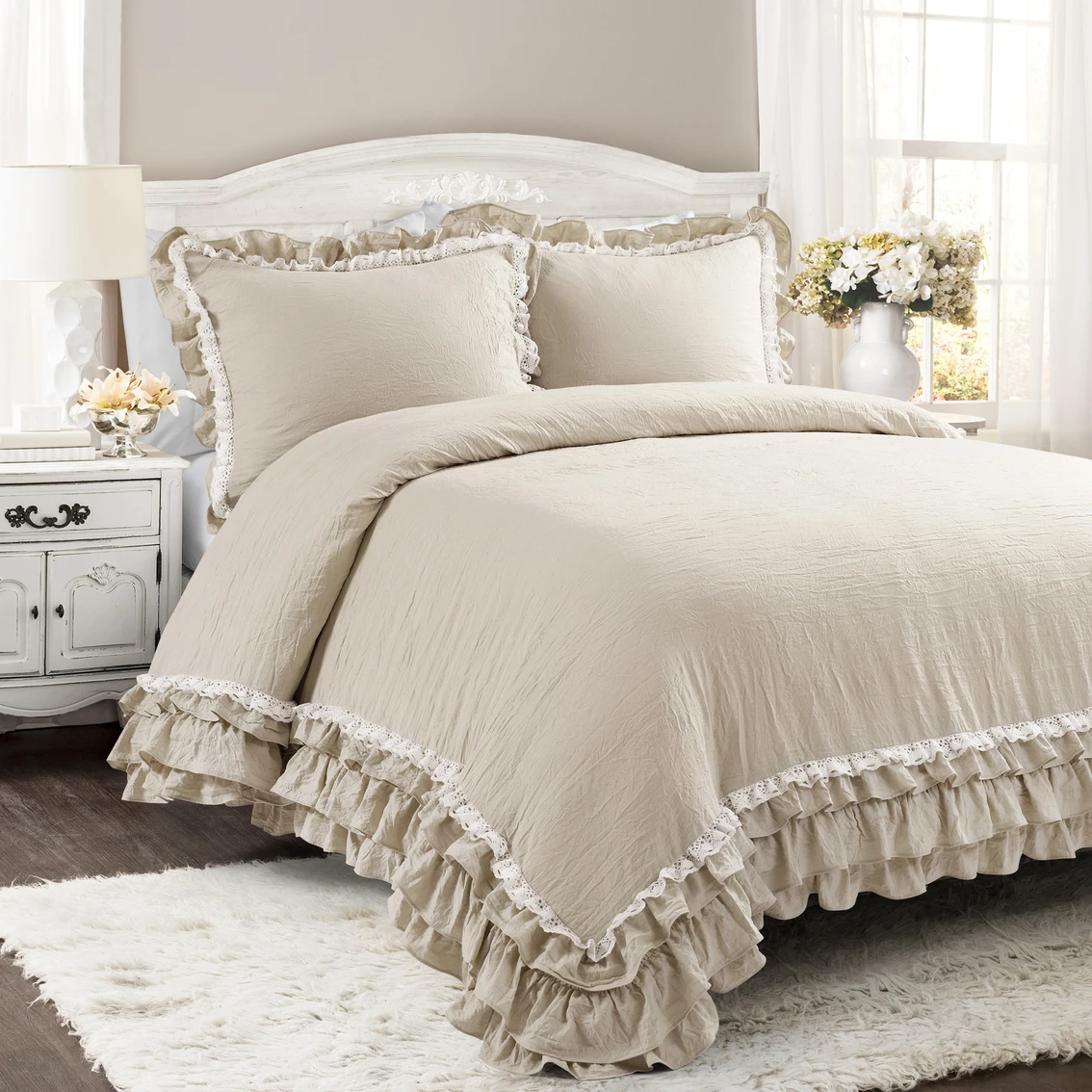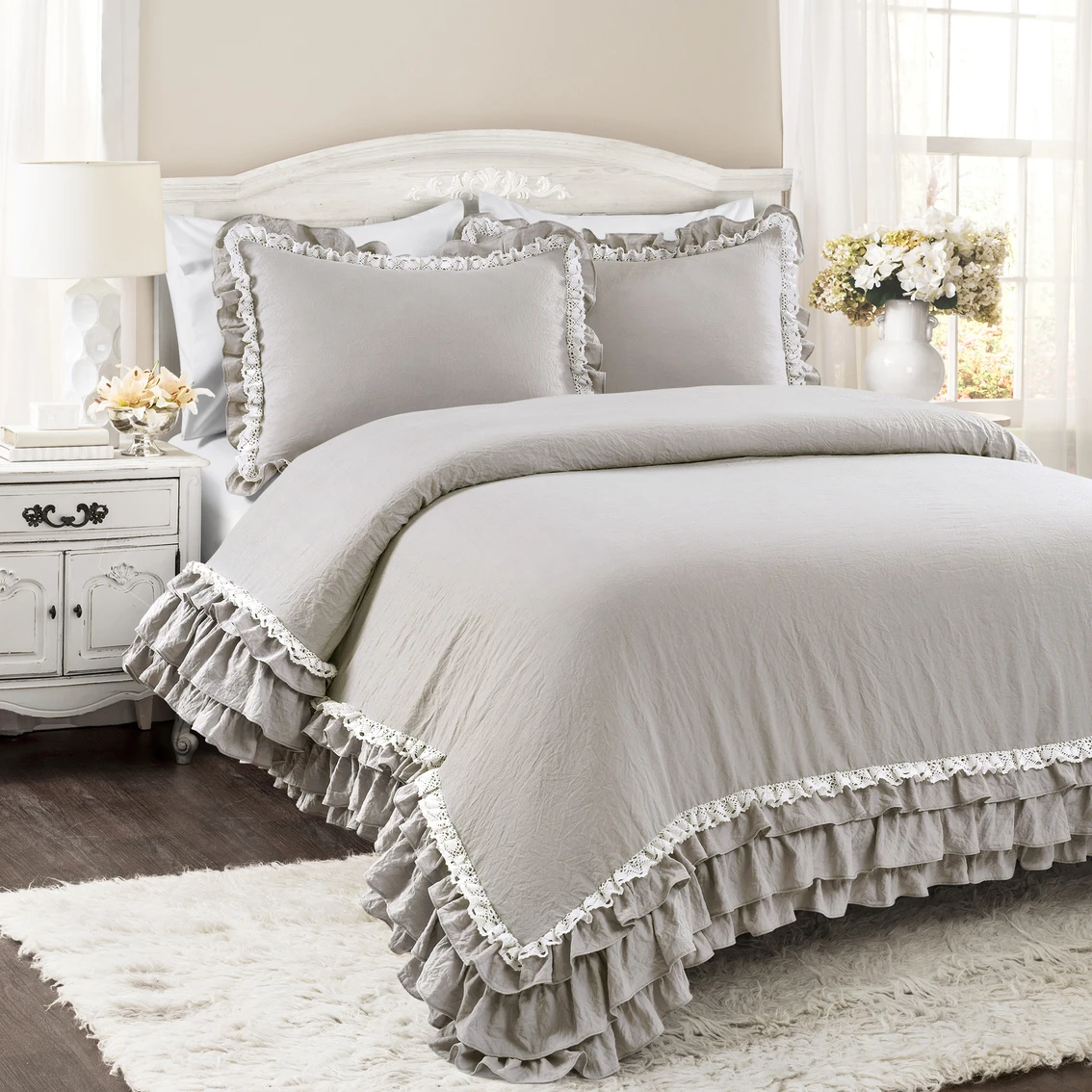 This charming Ella Shabby Chic Ruffle Lace 3-piece Comforter Set from Lush Decor will add a touch of feminine style to any bedroom or dorm room. The lace trim and layers of ruffles add flair to an otherwise minimalist look that can also fit into farmhouse, shabby chic, traditional or French Country themes. Style: 16T004407.