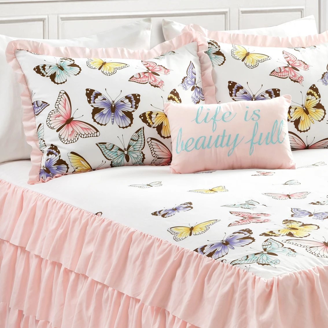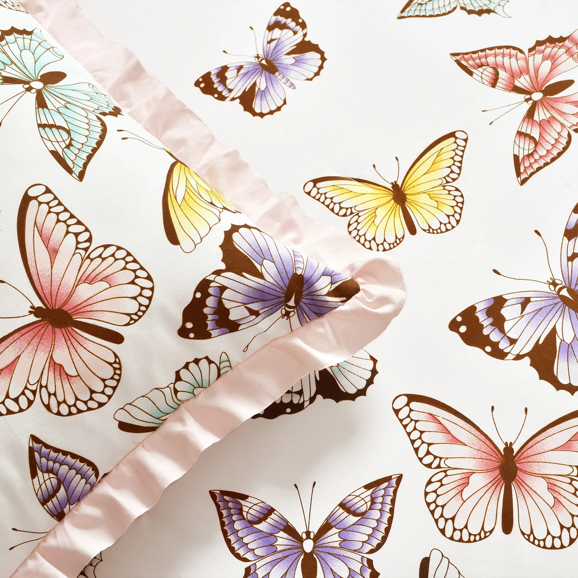 Give your child a peaceful space fit for a princess with this beautiful bedspread set from Lush Decor. This set combines colorful butterflies fluttering around with layers of ruffles that pool to the floor. This set comes complete with a unique decorative pillow. Available in Twin and Full sizes. Twin set includes 1 200 GSM bedspread, 1 pillow sham and 1 decorative pillow. Full set includes 1 80 GSM quilt, 2 pillow shams and 1 decorative pillow. Model: 16T0047.