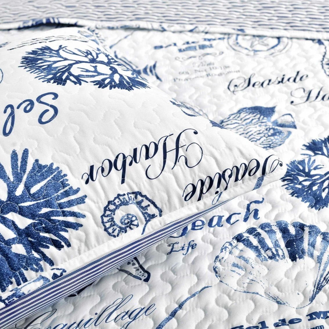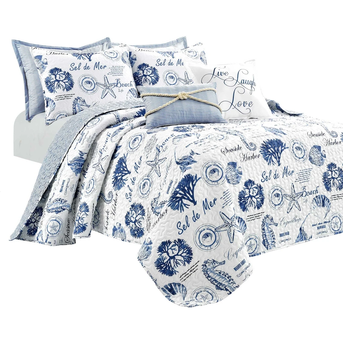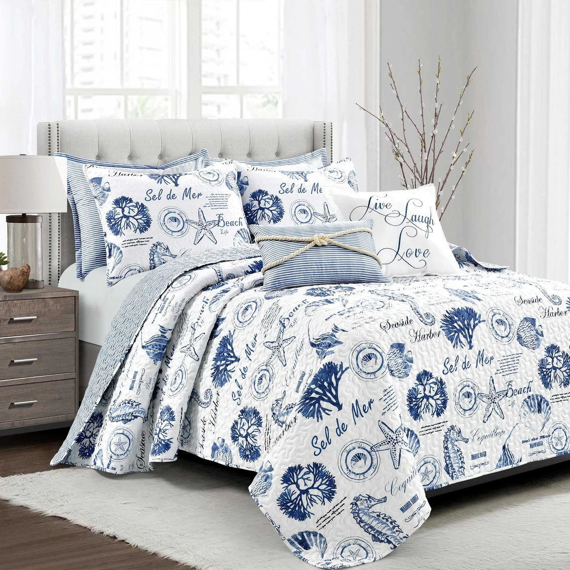 Star fish, seahorses and reefs combine to create a stunning pattern on this reversible quilt set from Lush Decor, perfect for your beach home or your coastal-themed bedroom. This 7 pc. set comes complete with matching shams and decorative pillows.