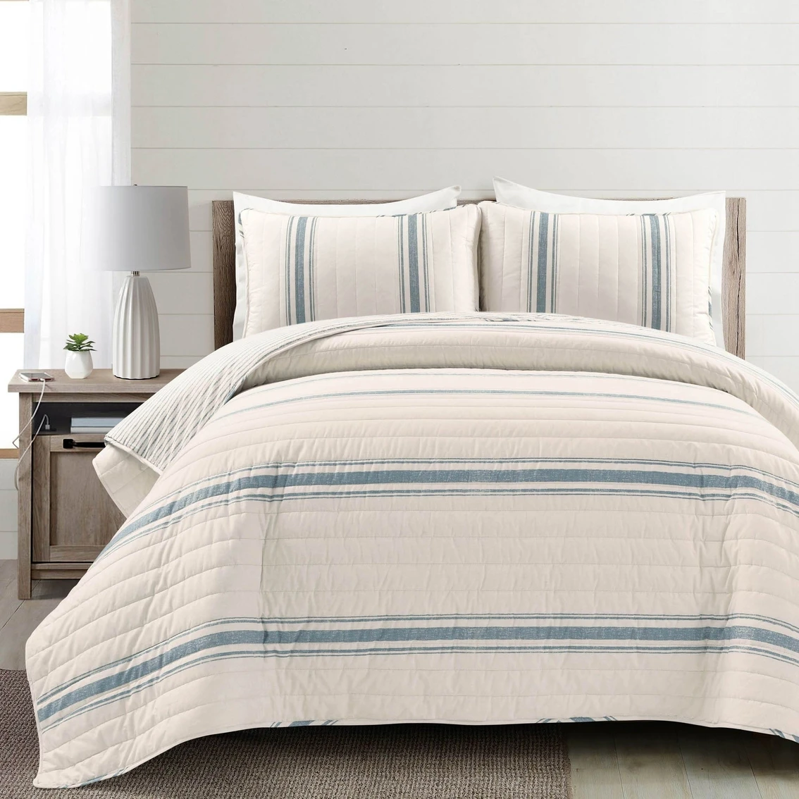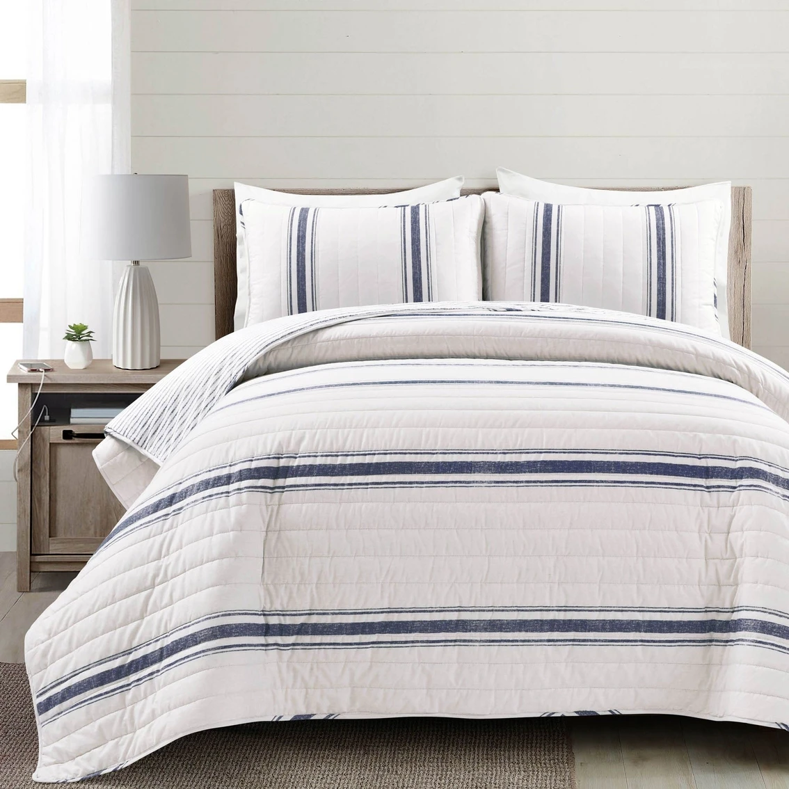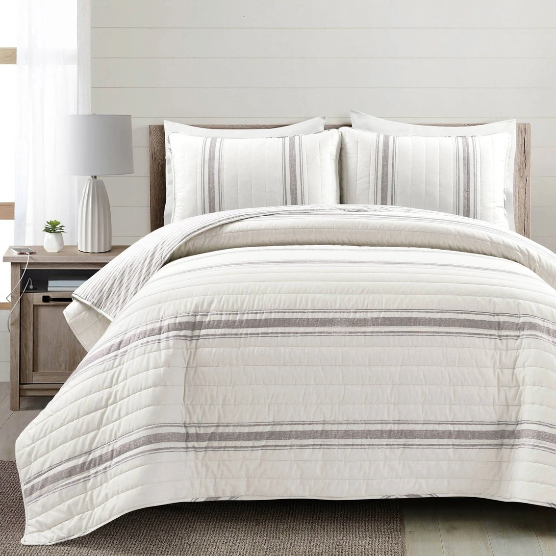 Decorate your master or guest bedroom with traditional farmhouse style. The printing on this set is reminiscent of shiplap beams. This 3-piece set includes a reversible cotton quilt and 2 matching pillow shams. The back features a pinstripe print. Style: