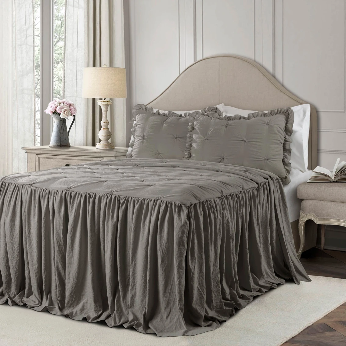 This beautiful bedspread set from Lush Decor is soft and luxurious feeling with hand tucking detail on crinkle microfiber and elegant ruffled edges. It fits in nicely with your farmhouse, minimalist or traditional bedroom. The twin set includes a bedspread and one pillow sham. The other sets include a bedspread and two pillow shams. Model: 16T0040.