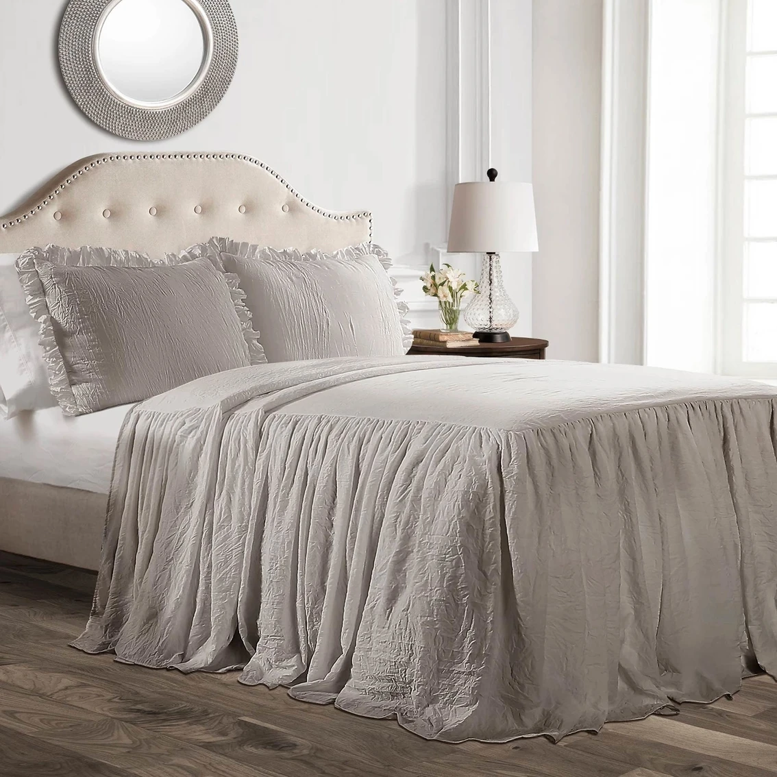This solid color set is soft and luxurious feeling with beautiful ruffle detail. Because it is light weight, it is ideal for layering and for use during the spring and summer. This generously sized 3-piece set includes a bedspread and 2 matching shams. Style: 16T002