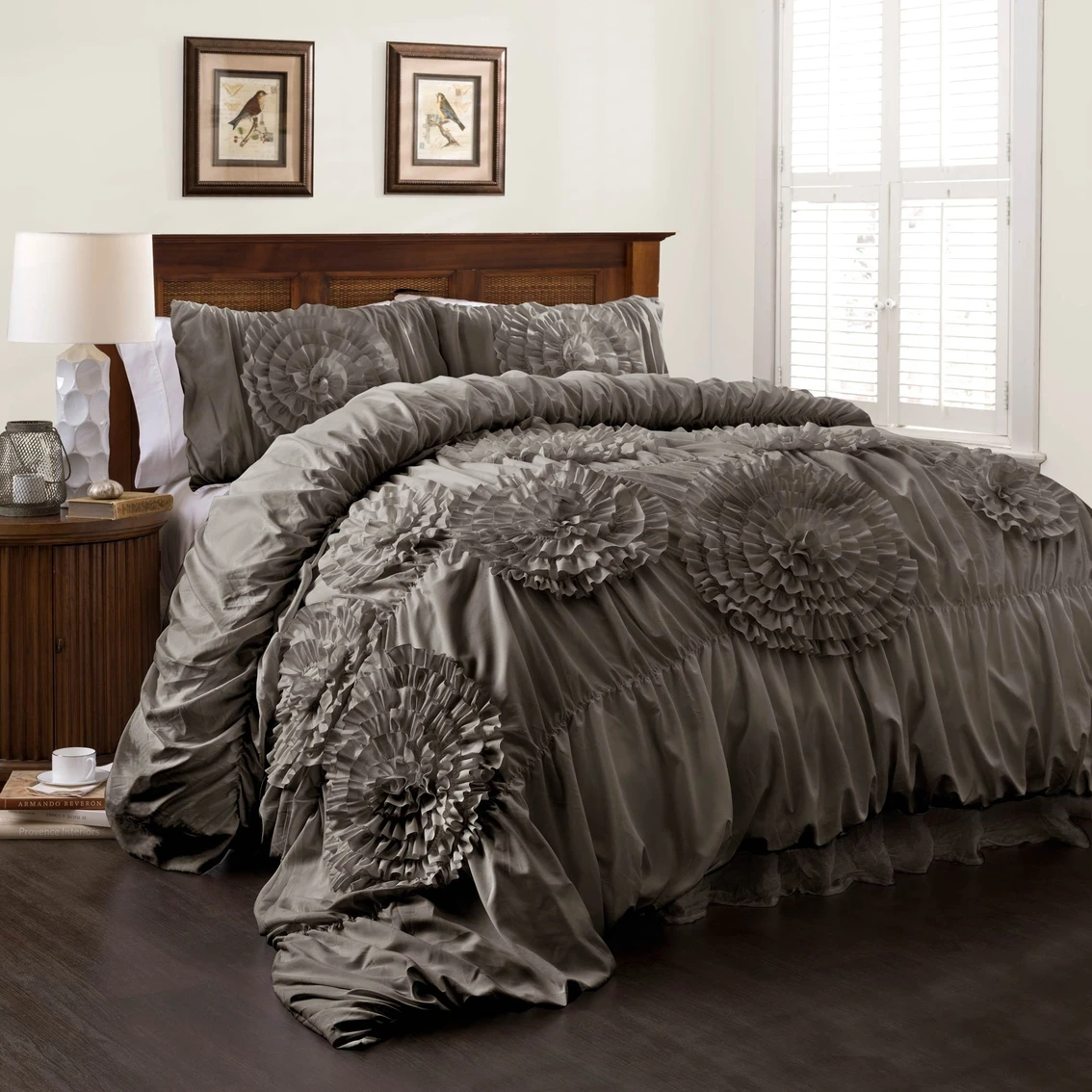 Made from heavily-brushed poly, the ruching of this Serena 3 pc. Comforter Set from Lush Decor creates a textured base which is so soft yet makes a perfect backdrop for the hand-crafted and engineered floral details. Even the pillow shams have matching floral details! Includes a comforter with quilted stitching and 2 shams.