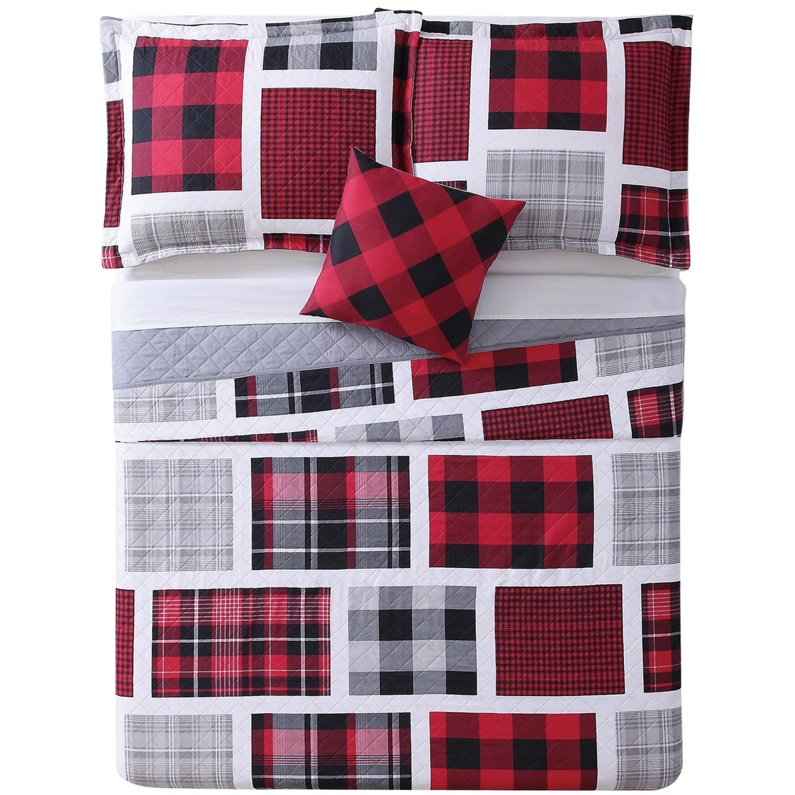 The classic pairing of red, black and white throughout the My World Buffalo Plaid Quilt Set gives this bedroom set a traditional and cozy look. The colorblock scheme on the quilt and pillow sham takes inspiration from patchwork quilts. Twin set includes quilt, standard sham and throw pillow. Full set includes quilt, two standard shams and throw pillow. Style: QS1938TW3-260.