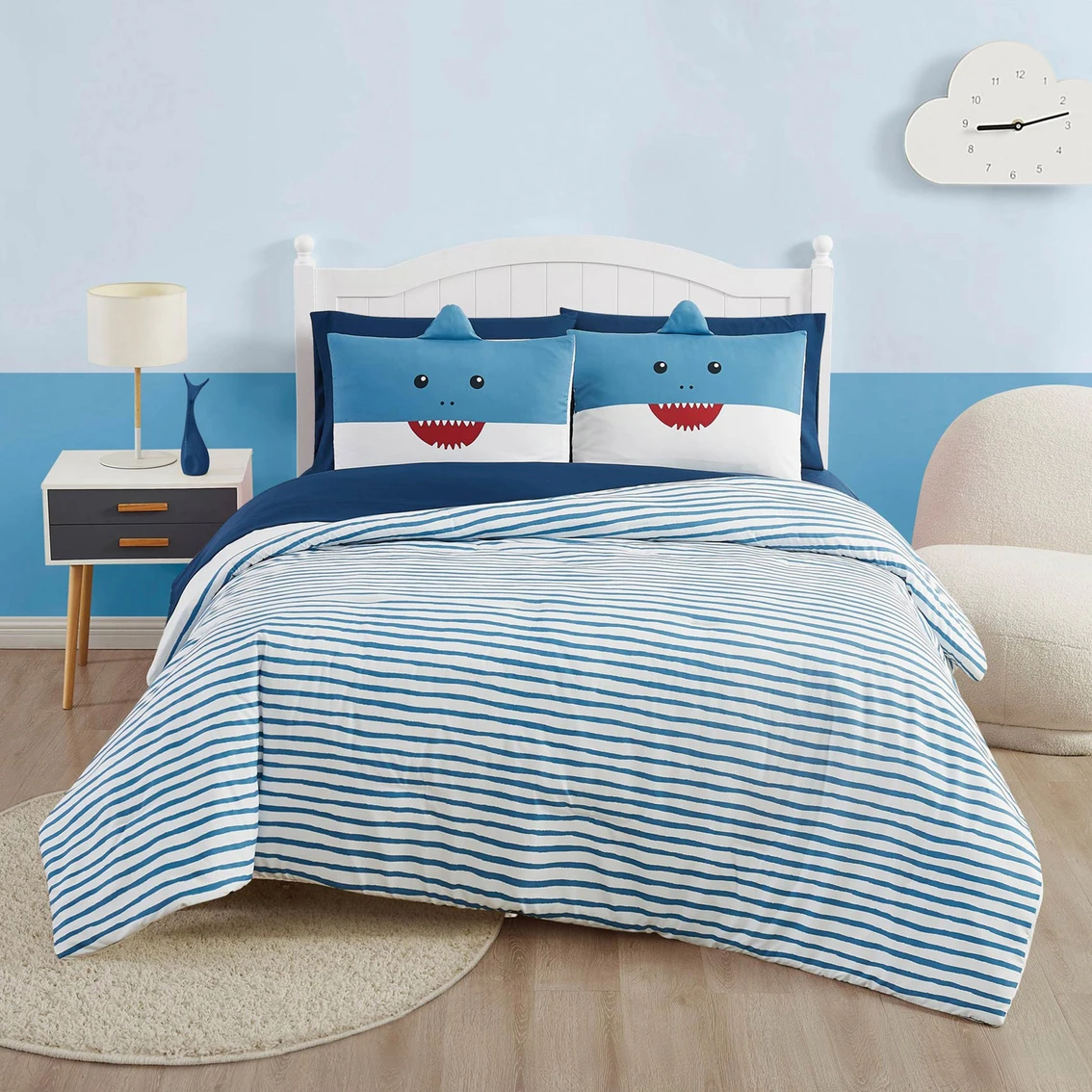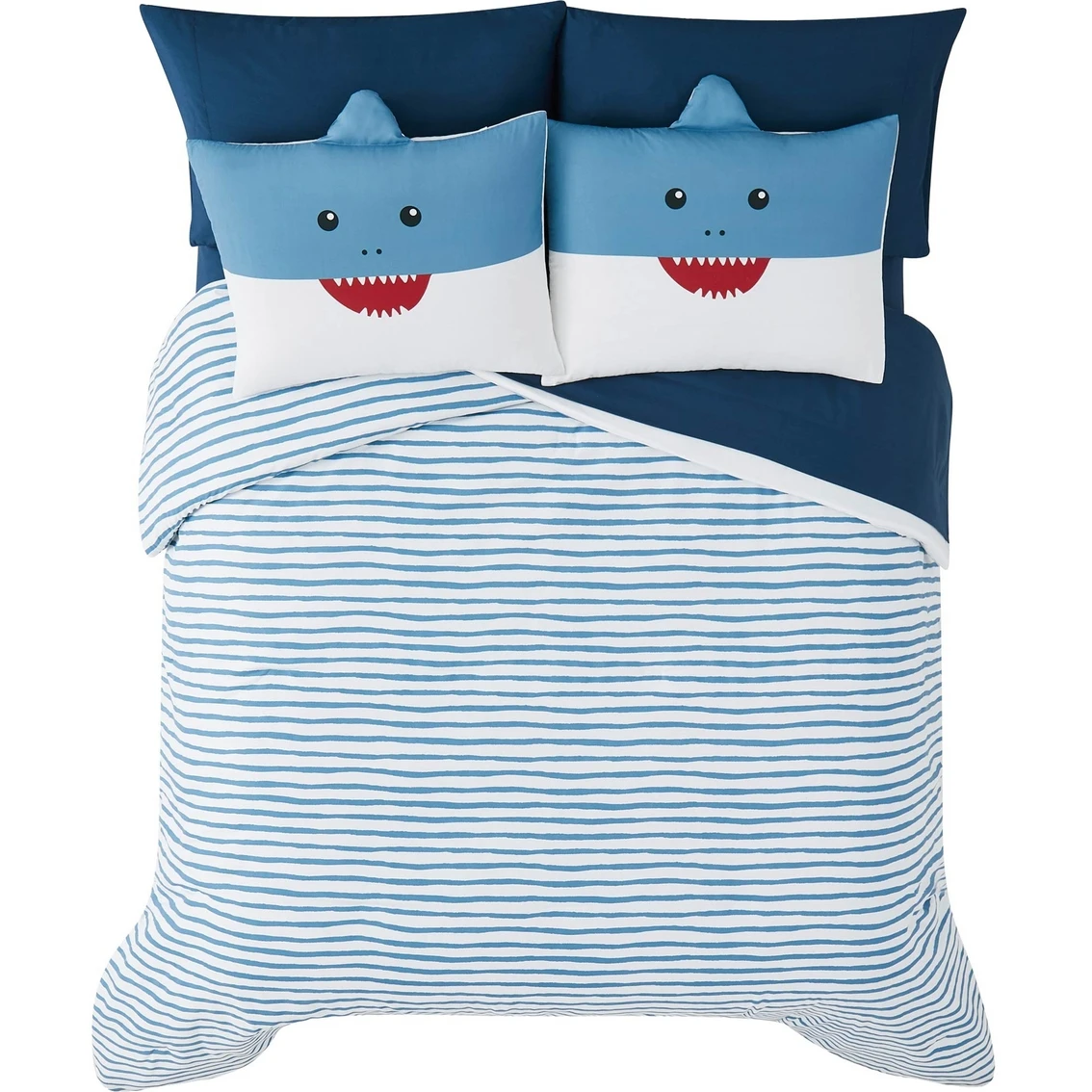 A simple wave print provides a home for your aquatic friend in this My World Happy Shark Bed in a Bag 7 pc. Set. The amusing set includes all your bed needs. The comforter features a minimal blue-on-white wave print with a solid white reverse. The pillow sham(s) feature a friendly shark face print with an attached fabric fin to bring it to life. This set includes sheets and pillowcase(s) in a coordinating deep sea blue. All items are made of a microfiber polyester and the comforter has a polyester fill. This set is CPSIA Certified Safe, which means it is lead free and phthalate free so your little one will not just have fun, but also be secure. Model: BIB4802QN-3200.