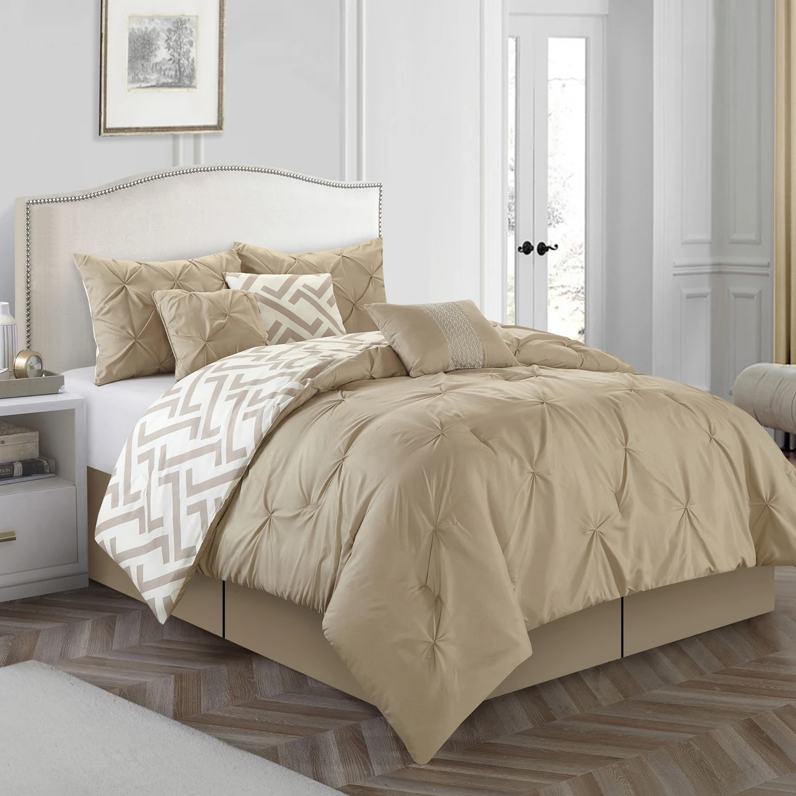 Refresh any bedroom with the Nanshing Loren Comforter 7-piece set. This stylish ensemble features a fully reversible comforter. The solid side is adorned with edge to edge pin tucks and the reverse side a Modern Geometric Print. This set also includes two shams, three coordinating decorative pillows, and a bed skirt to finish this look and create your restful retreat. Style: LOREN.