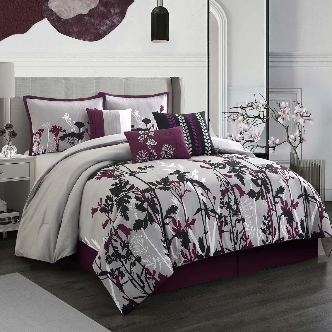 Lighten up your bedroom with the Focus 7 pc. Comforter Set from Nanshing. This beautiful set features engineered print modern look floral on the design and a brushed microfiber reverse. Big scale and engineered look to this set gives a 3D effect to the top of bed for added value. Sharp and contrast colors make it very dramatic and match with any wall colors. Set includes comforter, bedskirt, two pillow shams and three decorative pillows.