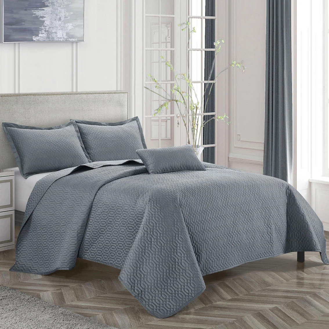 Give your bedroom an elegant makeover with this beautiful 4-Piece coverlet set from Nanshing America Inc. This set includes a coverlet, two matching shams and a matching decorative pillow. Each piece is woven from 100% cotton sateen and finished with a luxurious soft hand. Each piece of this ensemble features a modern geometric quilted pattern. Model: Kent4-CL/size/color.