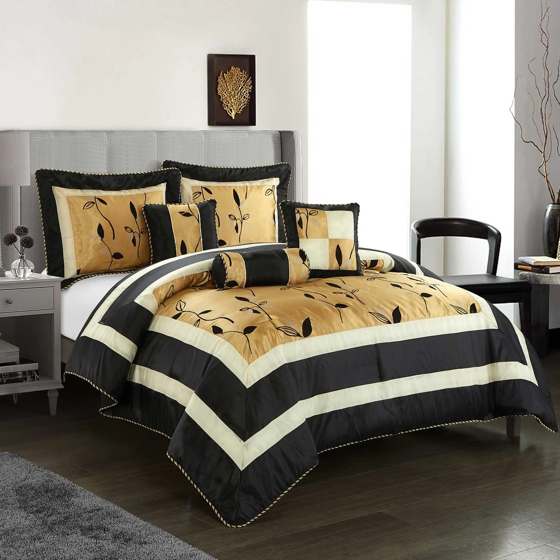 Achieve the elegant sophisticated style you are looking for with the Pastora comforter set from Nanshing America Inc. The Pastora comforter features a black flocked modern leaf pattern with metallic print accents on taffeta fabric, framed in bands of contrasting colors and finished with a corded trim along the edge. The matching shams are also framed in taffeta and finished with the same corded trim. The comforter and decorative pillows are filled with polyester for a soft comfy loft without being too heavy. Coordinating pillows add interest with a pieced checkered pattern, center band of the flocked fabric pieced with solid, and a neck roll is finished with piping. Matching shams fit standard size bed pillows and also have the corded trim. The simple but elegant piecing and color blocking technique with flocking accents creates a 3D effect that is guaranteed to elevate any master suite or guest room. Model: PASTORA6/size/color.