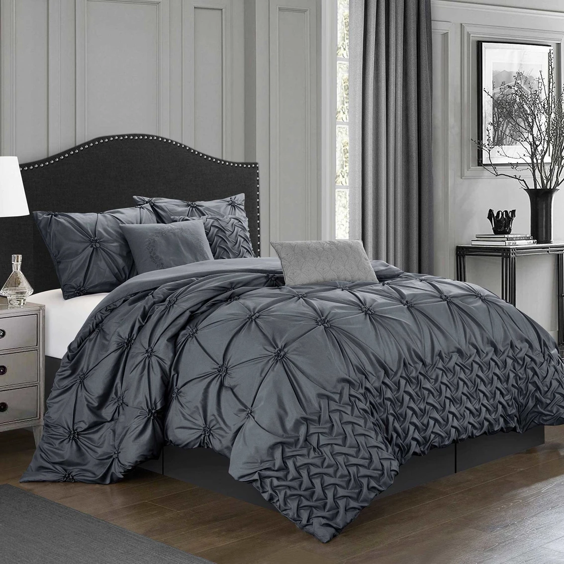 Dress your bed in timeless elegance with this lovely comforter set from Nanshing America Inc. Beautifully tufted with different pleating together. The exquisite bedding instantly brings a lavish look to any room’s decor. It is the best choice for all your bedding needs! Sleep better and wake up each morning feeling refreshed and full of energy. Its silky-soft feel makes it one of the most comfortable and luxurious microfiber sets you’ll find. Model: PIERCEN7/size/color.