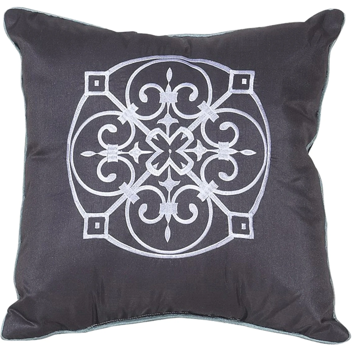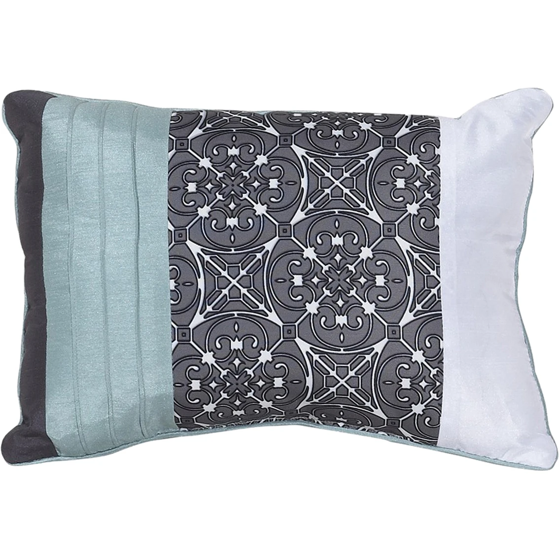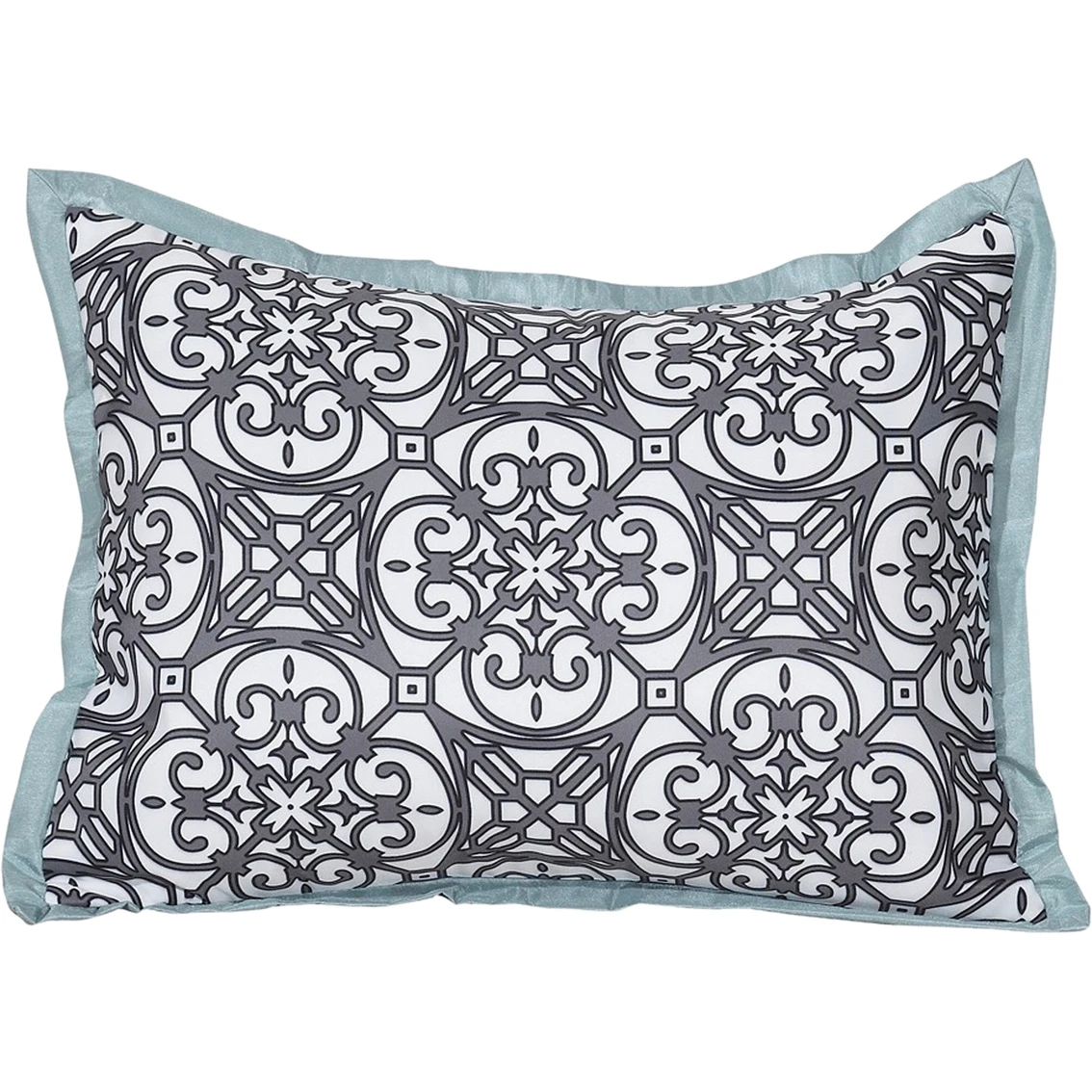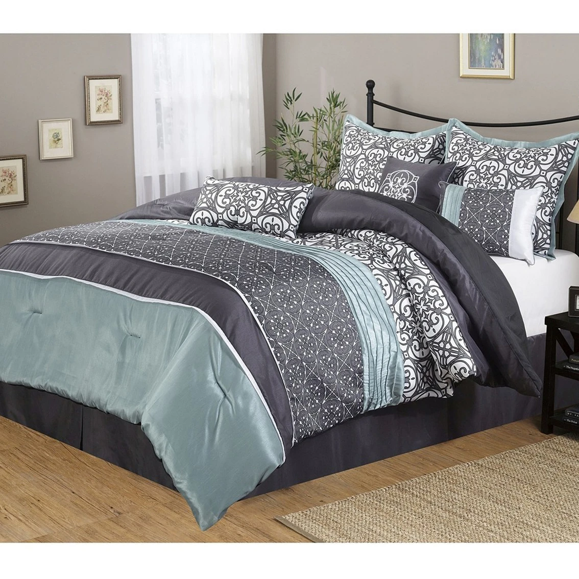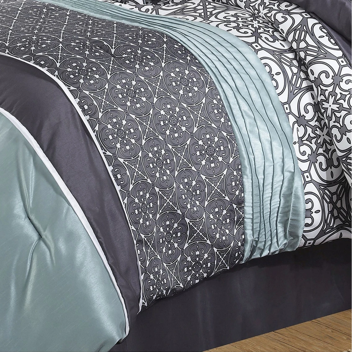 Add sophistication and style to your bedroom decor with this regal 7 pc. comforter set from Nanshing America Inc. The set includes a comforter, two pillow shams, three decorative pillows and a tailored bed skirt. The rich, soothing shades of gray and sea foam in multiple textures and patterns make for a gorgeous set, while the polyester filled comforter are pillows and plush and comfortable. Style: ROXANNE7.