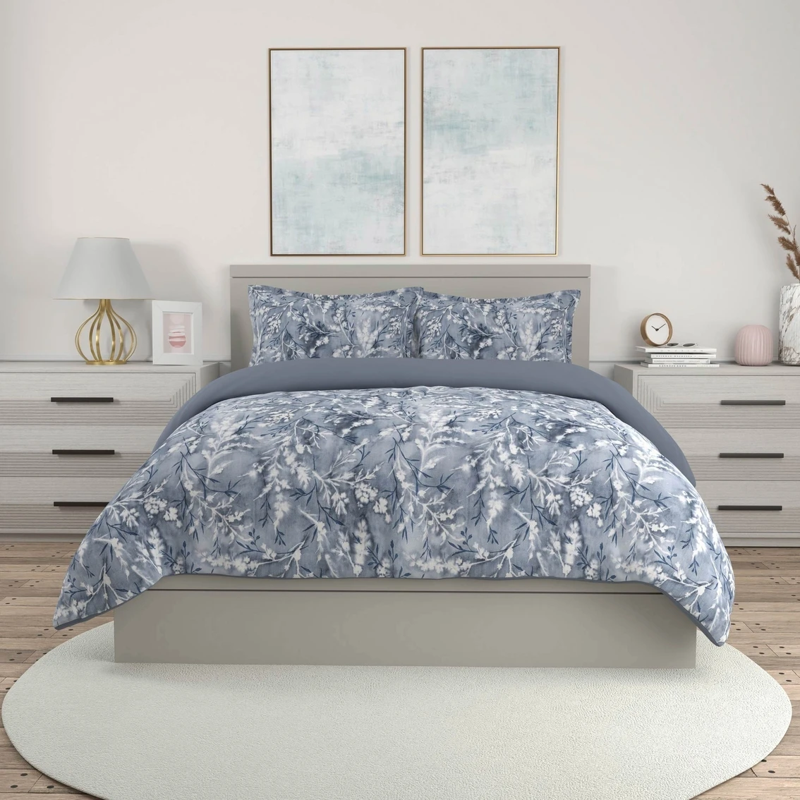 The ethereal spring floral print of the Albany Floral Comforter Set by Portico is a dreamy pattern on a rich cotton fabric to make for a beautiful, calming feel for your room. The design is printed on a gray and navy brushed background on 300-thread count, cotton sateen while the sun printed branches create a full coverage design. The reverse of the set is a solid blue to coordinate with the hues of floral face. The set is made from 100% cotton fabric and the comforter is filled with 100% polyester for year-round warmth. Our responsibly made items are made better, so that you can live better. The cotton is sustainably produced under the Better Cotton Initiative standards and the set is manufactured following the Oeko-Tex Standard 100 certifications and are verified to be free from harmful levels of more than 350 substances. Style: CSP09FQAL.