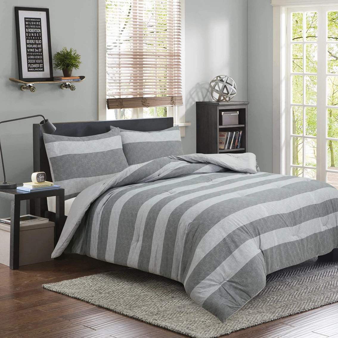 This Heathered Jersey Knit Comforter Set will remind you of the comfort and softness of your favorite t-shirt. The heathered colors and quilted pattern creates a rich tonal look that pairs easily with any bedroom. Made from 50% cotton and 50% polyester jersey knit blend, this comforter set is incredibly soft and machine washable for easy care. Durable construction. Pillow shams included.