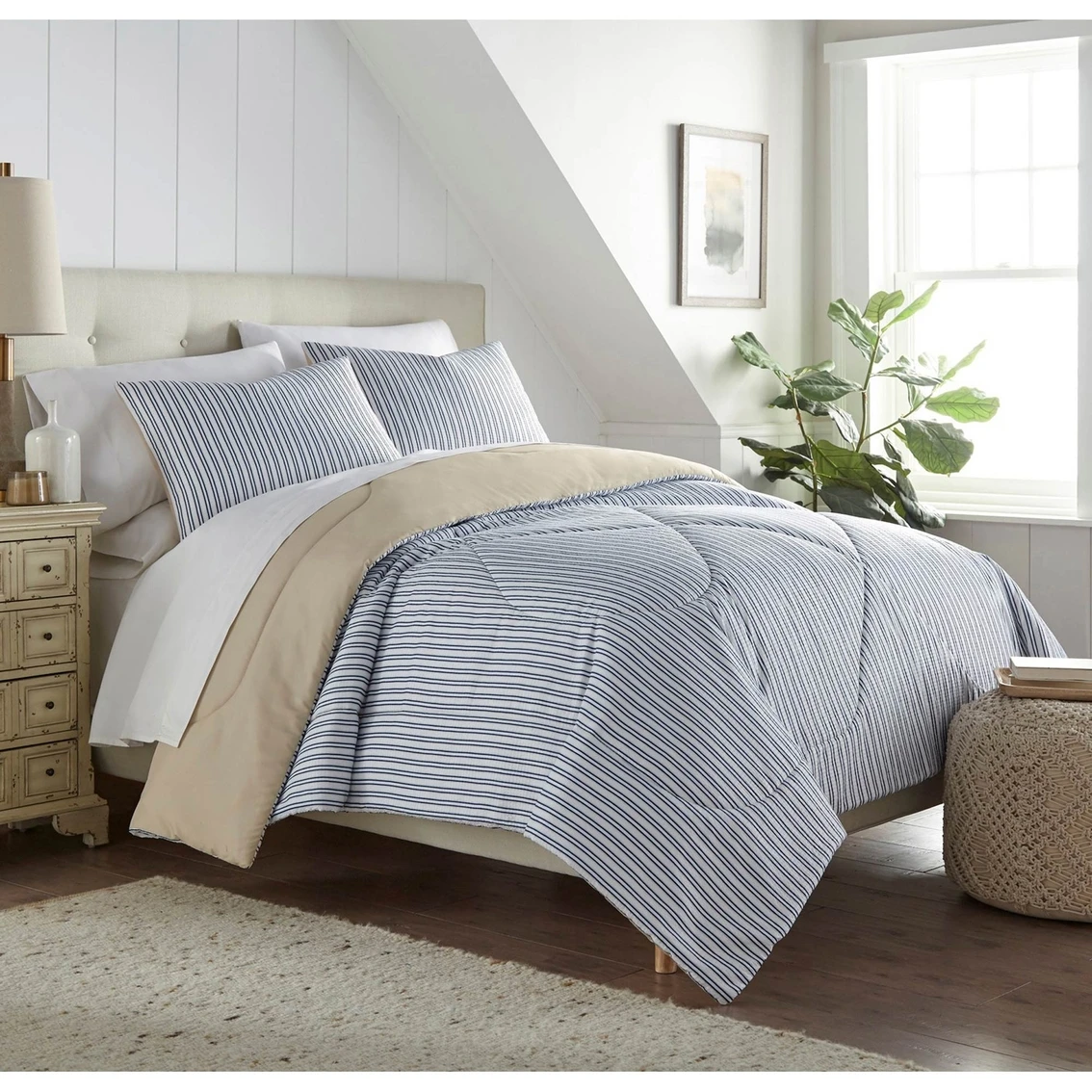 Shavel Home Products Seersucker Comforter Mini Sets create a relaxing and tranquil atmosphere in your bedroom. Crisp and cool, the textured seersucker enhances the mid-weight, refreshing spring and summer feel of this exceptional fabric. Stylish and modern, the printed designs add life and beauty to your bedroom. This blanket is great for shore, lake, beach or anytime. Easy care, this comforter and sham resists wrinkling. Machine wash and dry. This set includes two shams and one comforter. Style: SERCMFQSPL.
