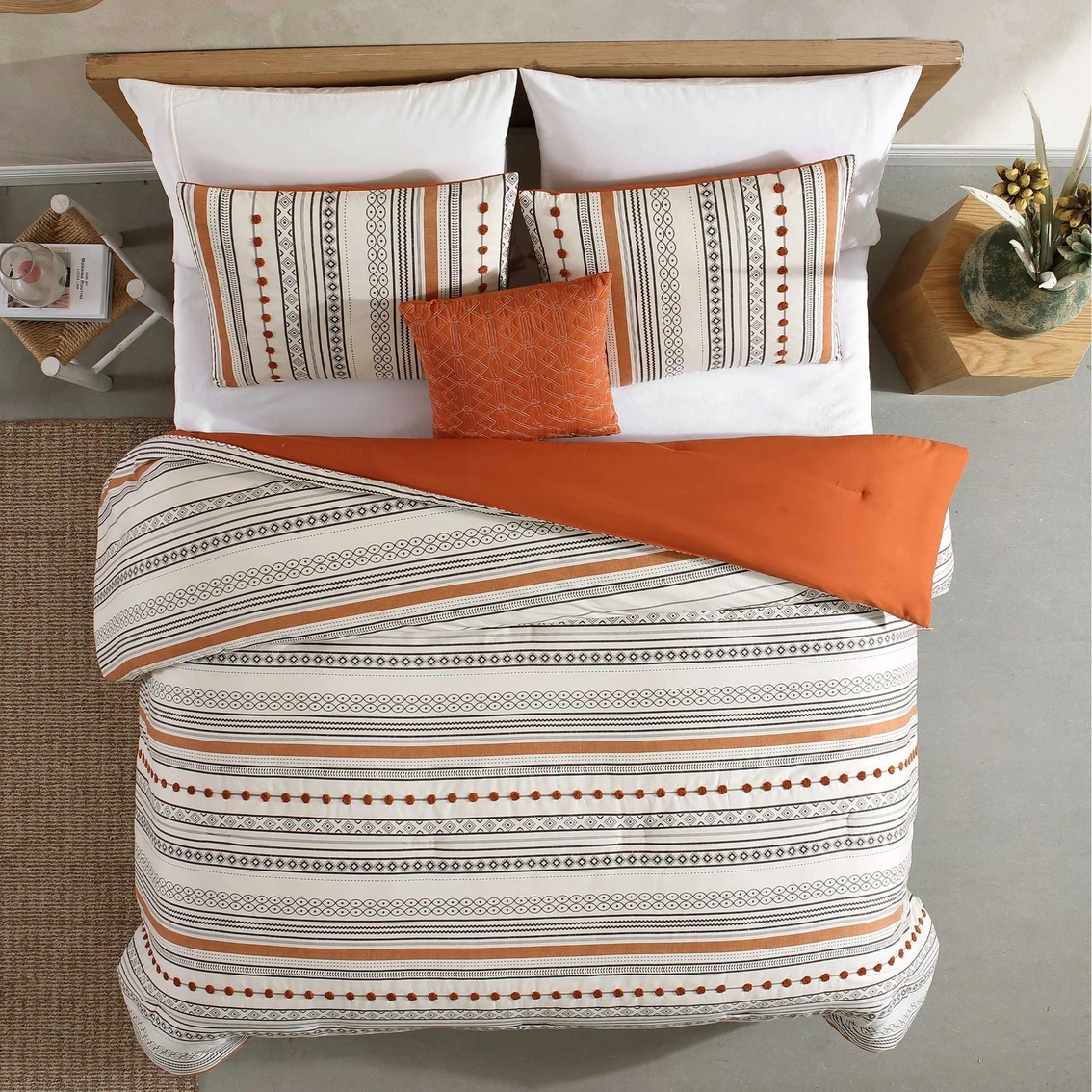 Silver & Sage’s Layne is a four-piece bedding set featuring a bohemian-inspired print on microfiber with tufted pom pom trim running horizontally through the bed. A highly textured pattern in trending colors such as rust, ivory and black makes for the perfect global look. Model: 3MLTICS1-LYN.