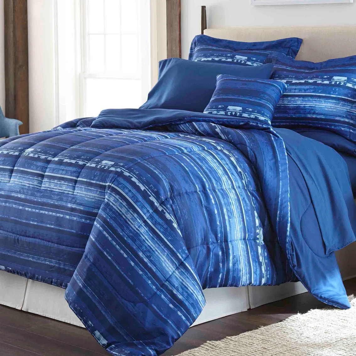 This complete bedding set features a super-soft printed reversible comforter made with very fine polyester filament yarns. Guaranteed to be a favorite in your home, many beautiful shades of blue set a soothing and stylish tone.