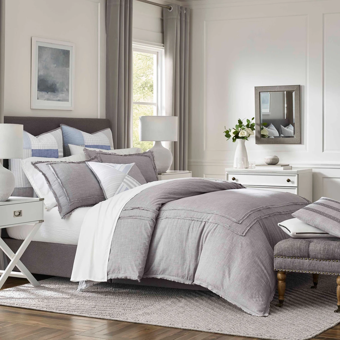 Bring the relaxed look and feel of chambray into your bedroom with Southern Tide’s Bayview Comforter Set. Soft and comfortable, this comforter can stand alone or easily layer for a personalized look. The Soft gray 100% cotton yarn-dyed fabric is an updated classic, while raw edge appliqued trim gives subtle texture to the comforter and sham(s.) This raw edge trim frames both the sham(s) and comforter while the sham(s) have an additional fringe detail on all four sides. The sham reverses to a solid 100% cotton white fabric and has a center back two-piece closure for easy on and off. This set exudes casual elegance – a relaxed accent for your master bedroom or guest suite. Available in Twin, Full/Queen and King sizes. The Twin set includes one Standard sham, the Full/Queen sets include two Standard shams and the King set includes two King shams.