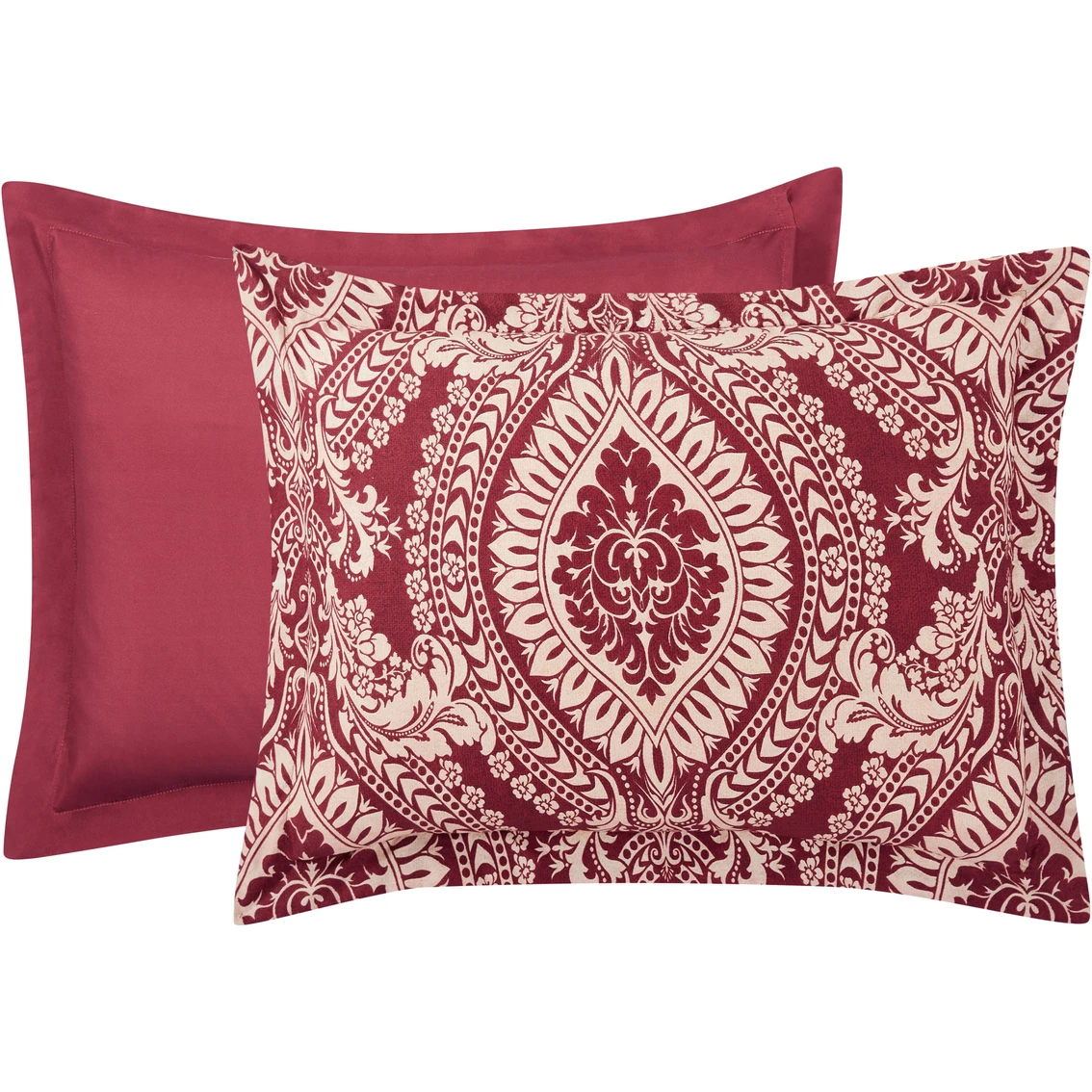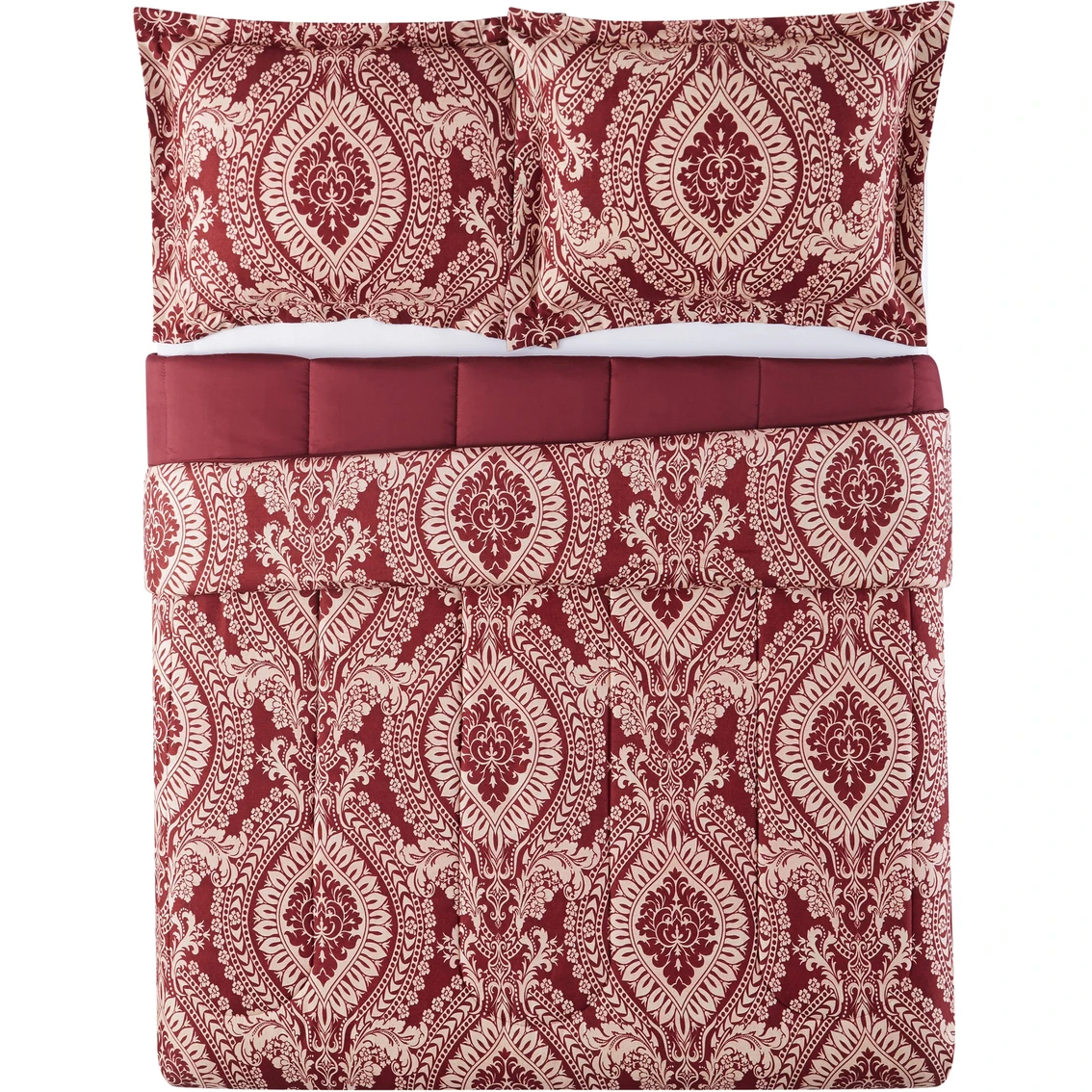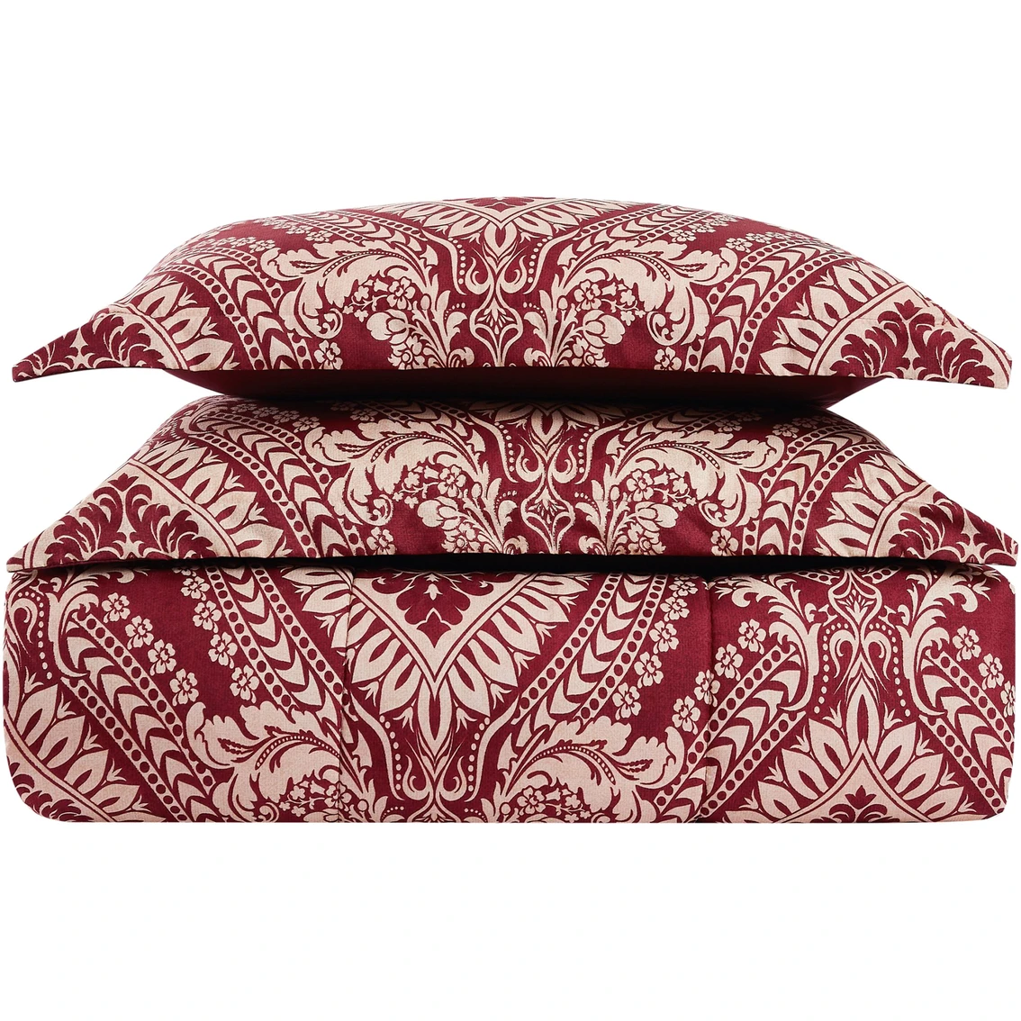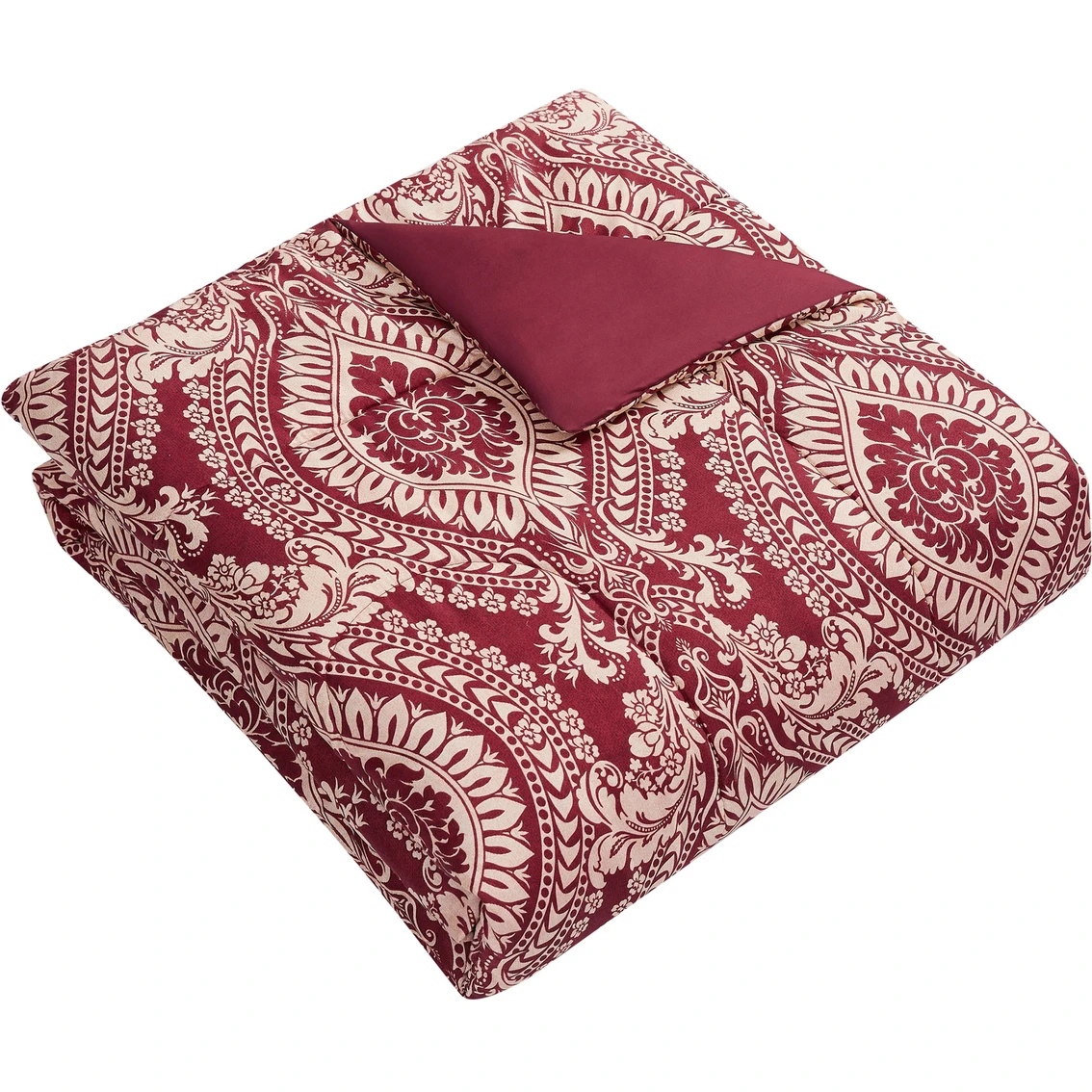 Add some statement-making style to any bedroom with the striking ogee medallion pattern from Style 212. This design is complete with a printed bold red and gold. The Jessa is a reversible comforter set that will perfectly accent any room. Style: CS4161FQ-1540.