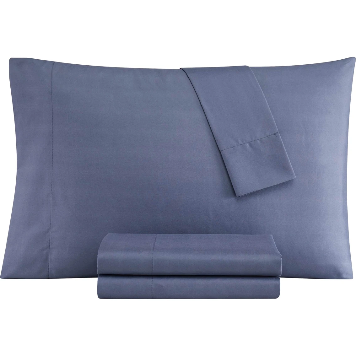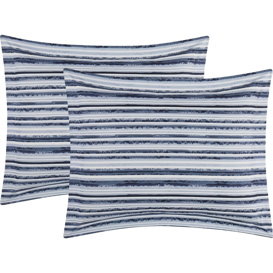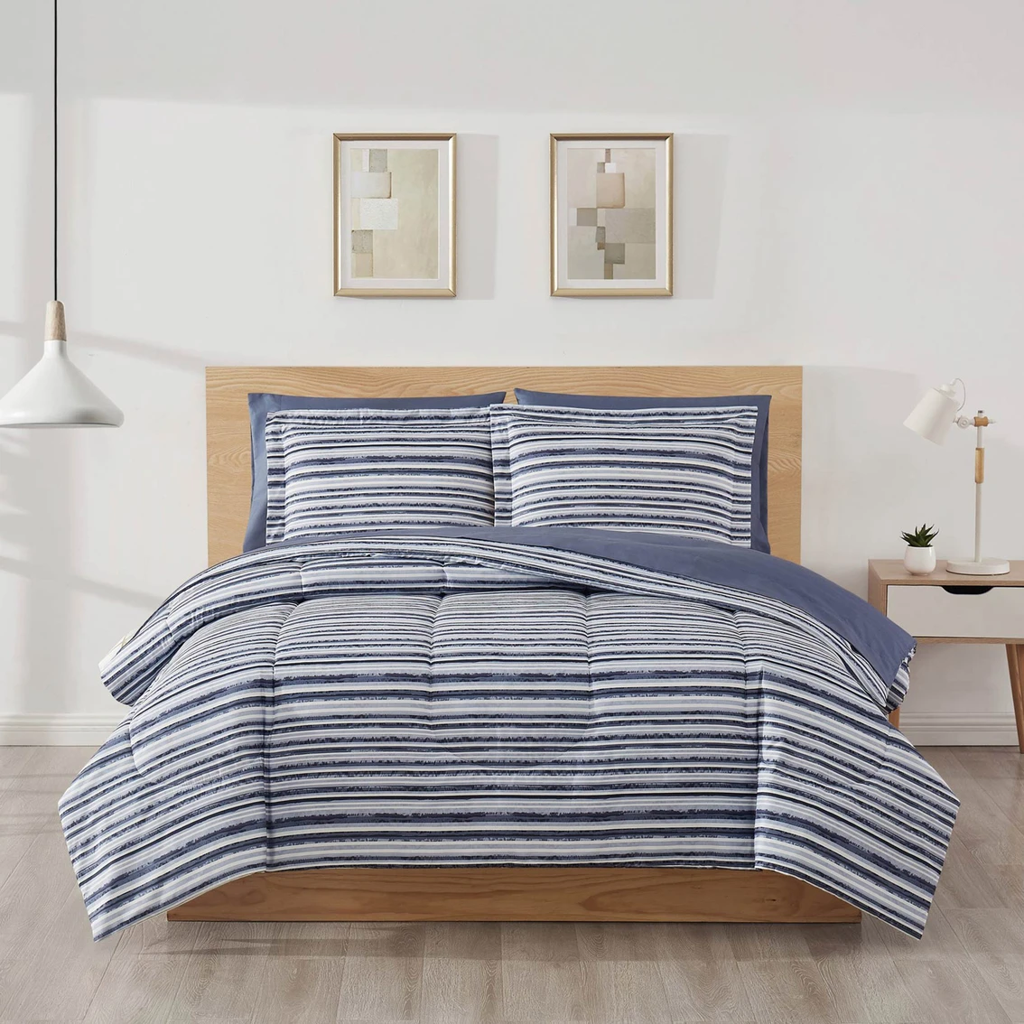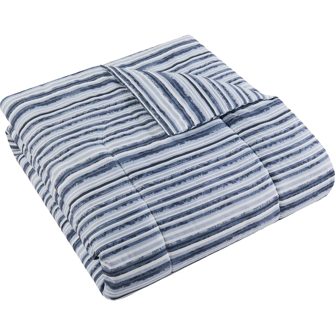 This modern stripe pattern with blue and gray stripes is the statement print for this Bed in a Bag 7-pc. Set from Style 212. The pillow shams use the same stripe print for the face. To complete the bed, this ensemble comes with sheets and pillowcases in a coordinating wide stripe pattern with shades of gray. The entire set is machine washable, making this a convenient addition to your home. Model: BIB4833QN-3200.