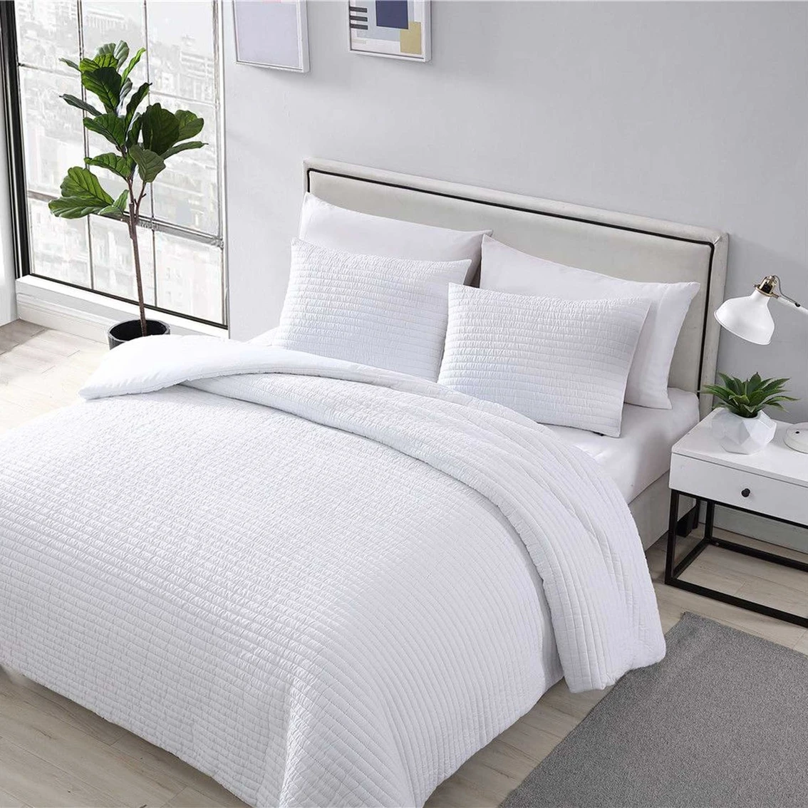 The Nesting Company Palm 3-Piece Comforter Set is simple and sophisticated. With its channel quilting pattern, it can create a cozy farmhouse look. Solid colors can also provide a relaxing space — great for winding down after a long day. Made from super soft microfiber, this set is perfect for year round use. This set is machine washable for easy care. Model: 900.