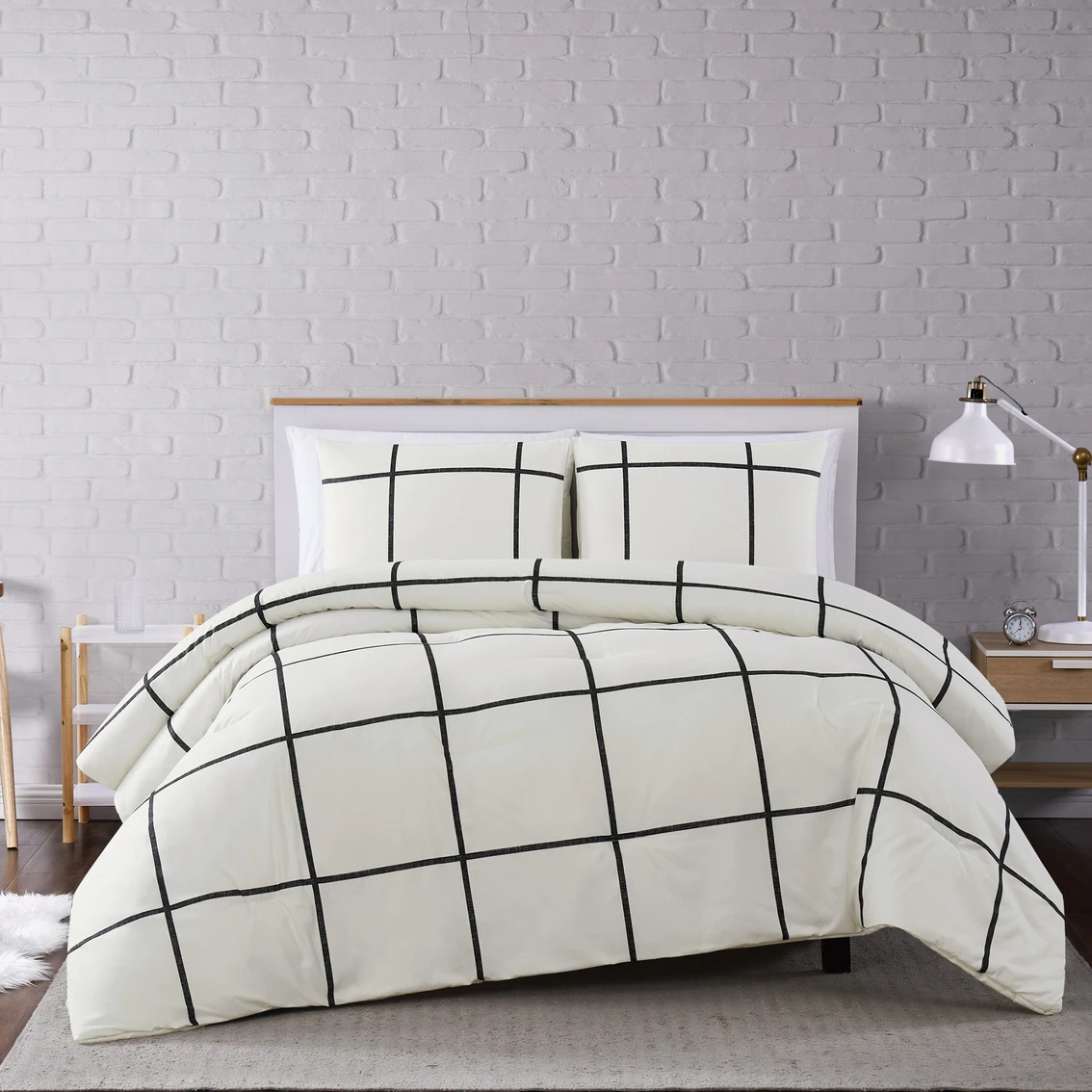 This easy to coordinate large scale window pane print is a great coordinate to a modern room or a simple coordinate to finish a bedroom. Includes: one comforter and standard sham(s). Face and back is 100% microfiber with 100% polyester fill. This item is machine washable, but please be sure to use appropriate sized machinery to avoid any excess wear on the items. This item is manufactured and imported from China. Style: CS3058.