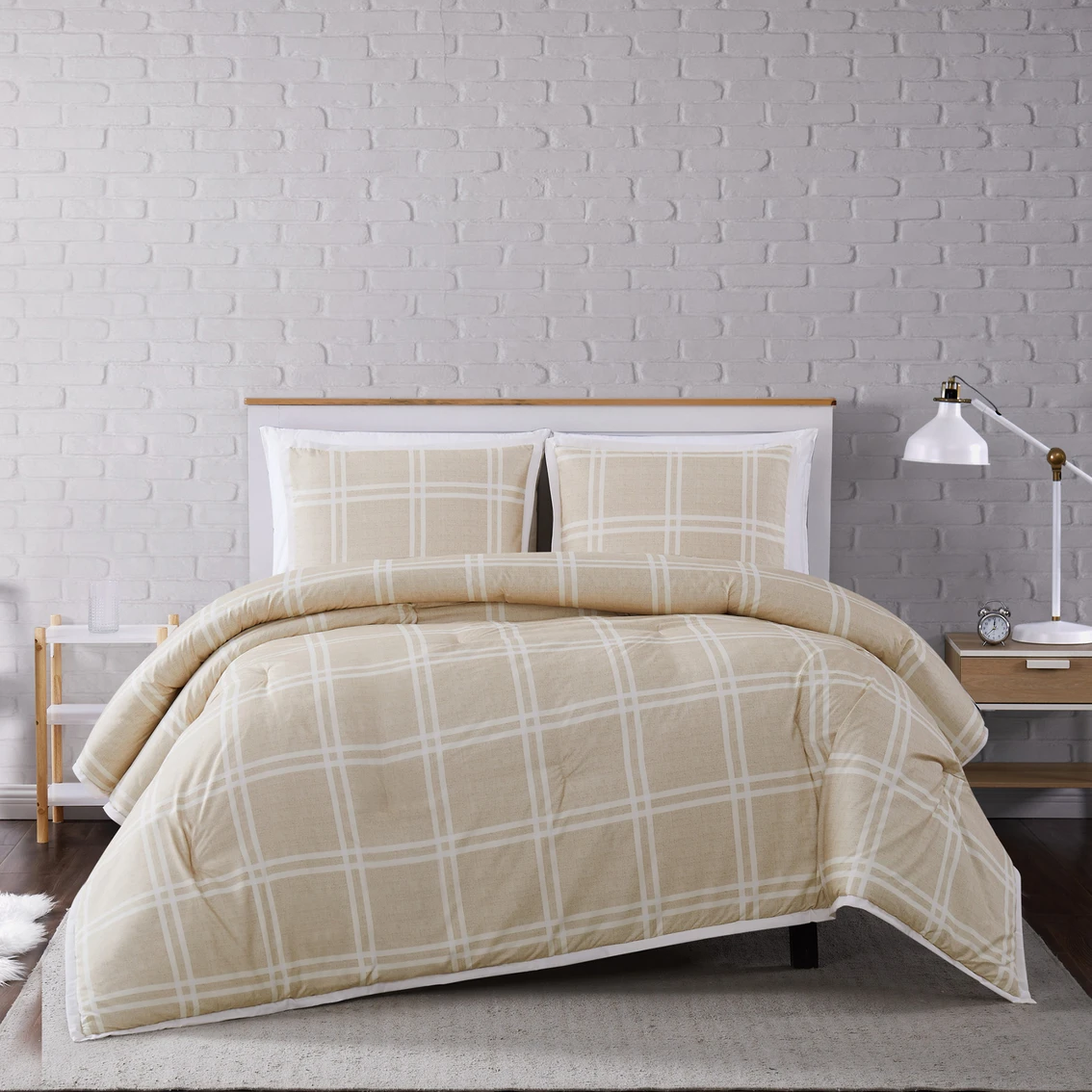 This easy to coordinate large scale window pane print is a great coordinate to a modern room or a simple coordinate to finish a bedroom. Includes: one comforter and standard sham(s). Face and back is 100% microfiber with 100% polyester fill. This item is machine washable, but please be sure to use appropriate sized machinery to avoid any excess wear on the items. This item is manufactured and imported from China. Style: CS3068.